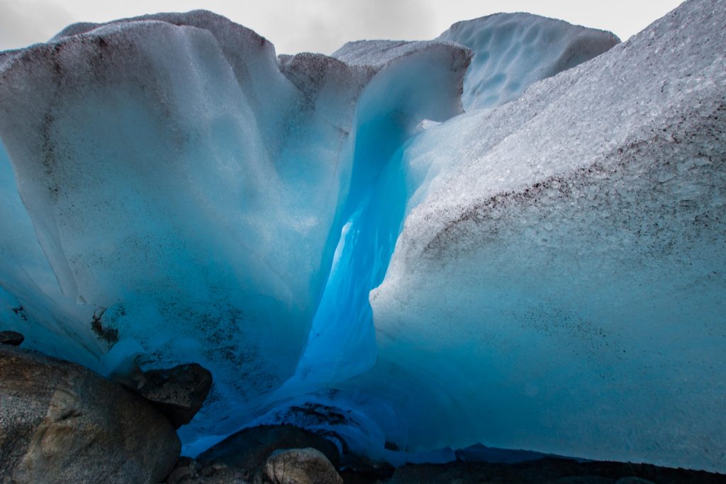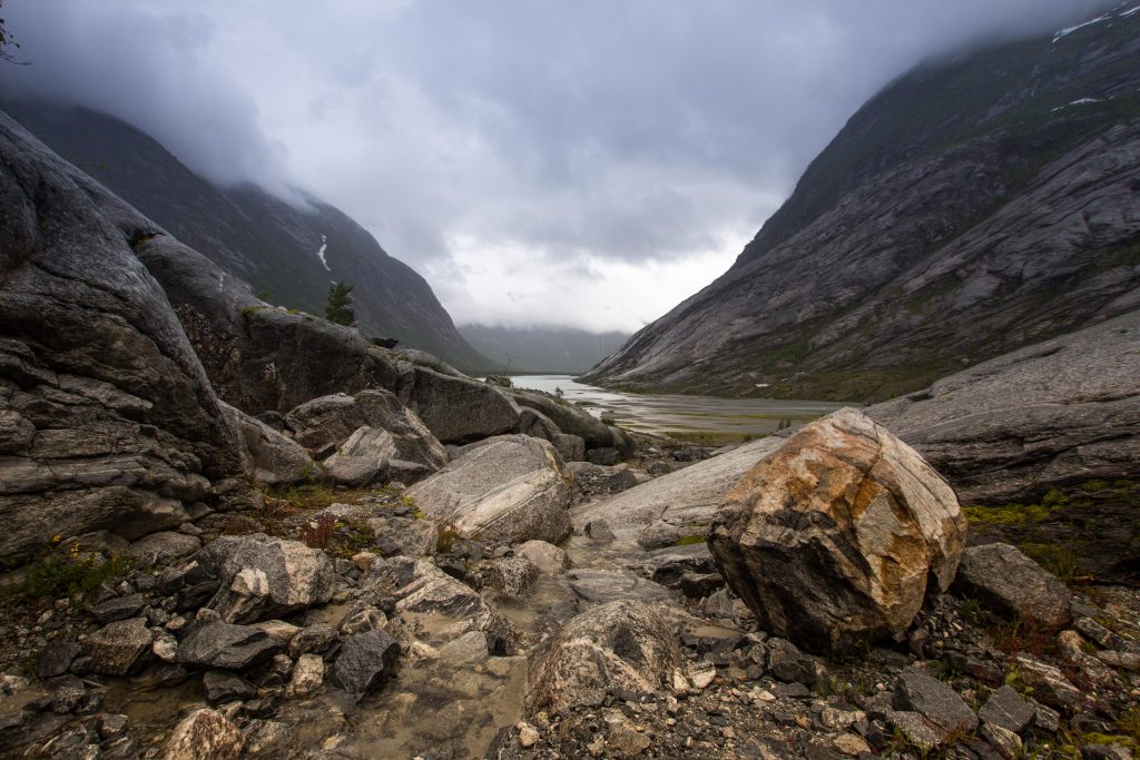 Es ist schon bald Nachmittag und die Wanderung zur Gletscherzunge Nigardsbreen liegt vor mir. Auch ein kleines Boot setzt über, aber ich will laufen. Man brauch ein knappes Stündchen und als ich ankomme, machen sich die anderen Besucher schon wieder auf den Rückweg. Eigentlich schön – der Gletscher und ich, so ganz allein … Aber hier ist ein Jahr zuvor ein Unglück passiert, ein Ehepaar wurde vom Eis erschlagen. Doch ich bin vorsichtig und betrachte mein Gegenüber mit Ehrfurcht.