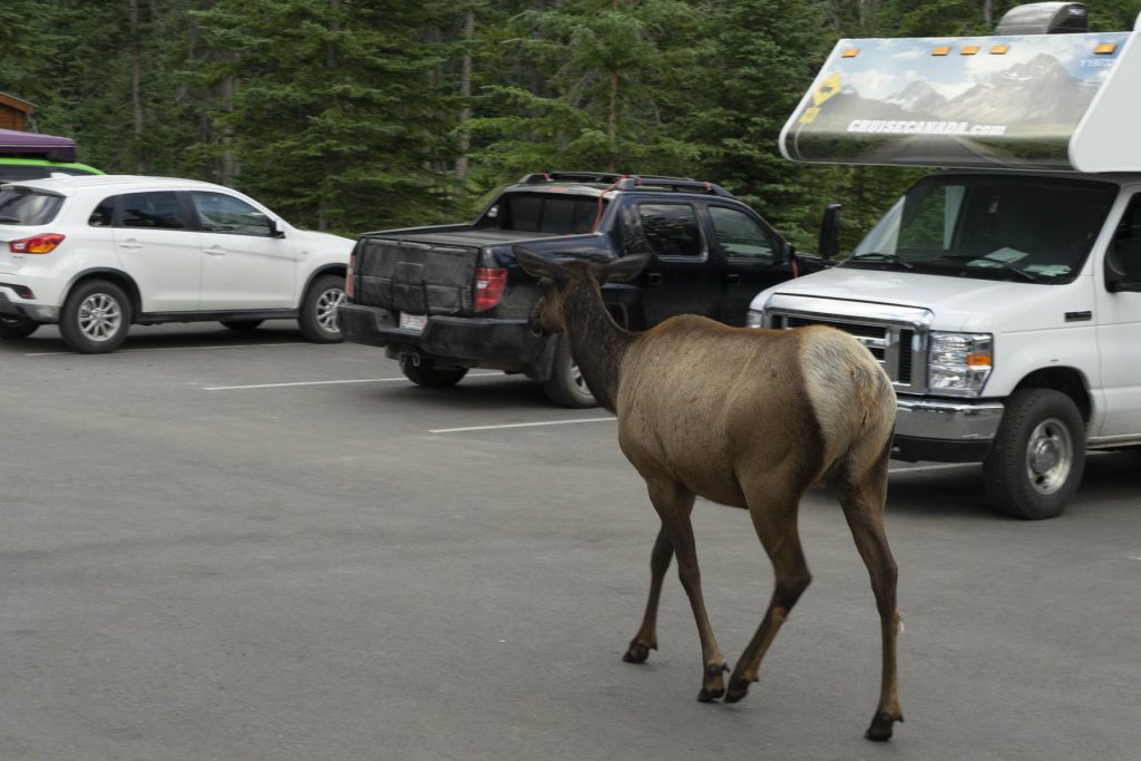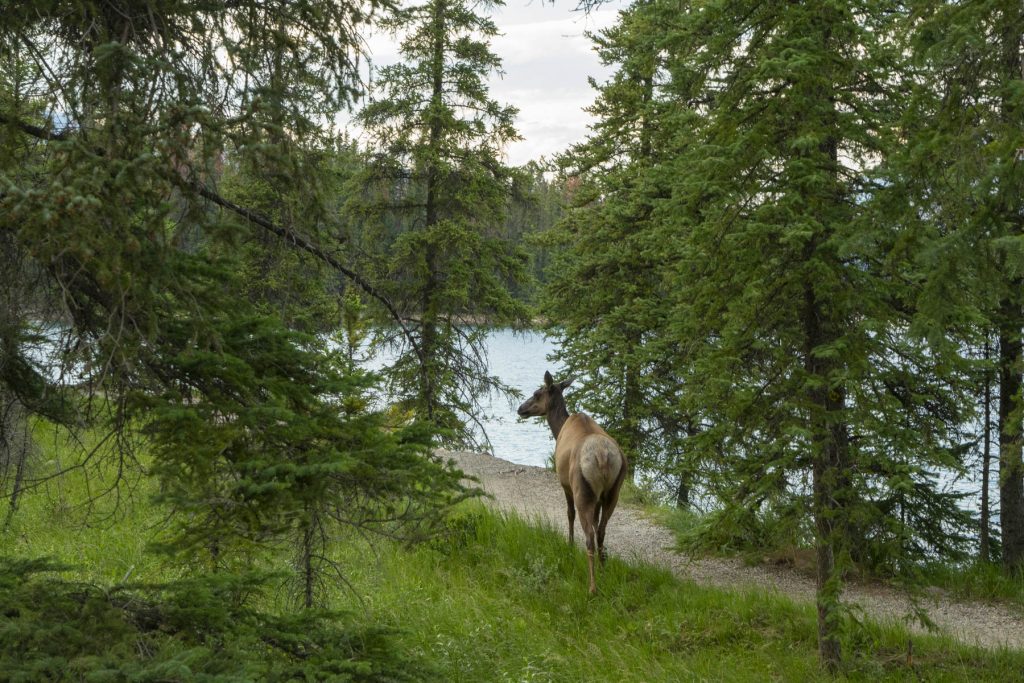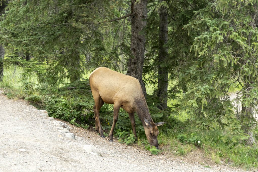Da raschelt es im Gras und erst ein … ich würde sagen Riesenreh – vielleicht ist es ein Caribou – erscheint auf der Lichtung. Dann raschelt es nochmal… und ein weiteres mit zwei Kitzen kommt dazu. Die 4 Leute auf dem Parkplatz werden ganz still und laufen plötzlich ganz vorsichtig, um die Tiere nicht zu erschrecken. Und die nehmen sich richtig Zeit, lassen sich nicht stören und gehen gepflegt ihrer Wege. Am nächsten Morgen sehe ich dann übrigens am Straßenrand noch so einen… ich schwöre! der sah wirklich so aus: