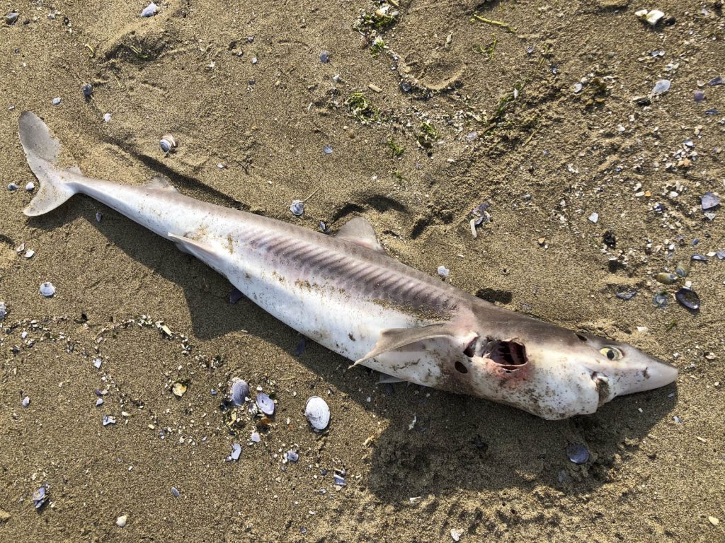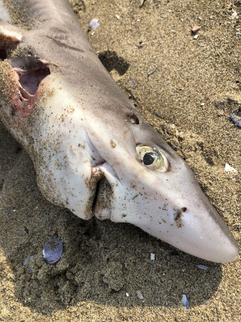 Und dann finde ich – nur die Möwen waren an diesem Morgen schneller – einen… hm … wer von Euch weiß, was es ist… sieht aus wie ein kleiner Hai …, den das Wasser über Nacht angespült haben muss.
