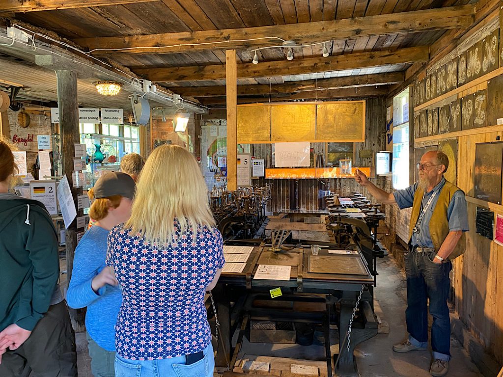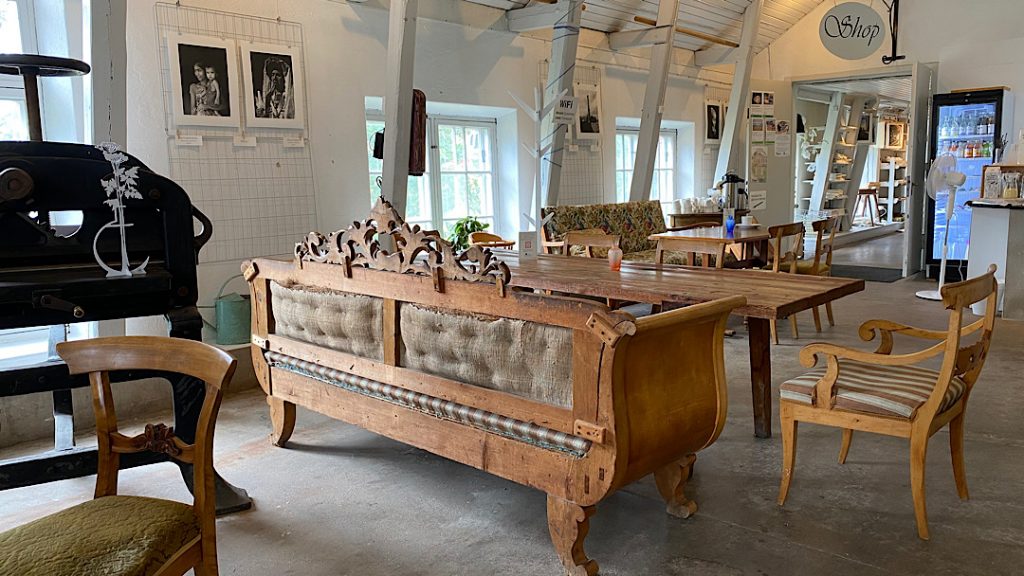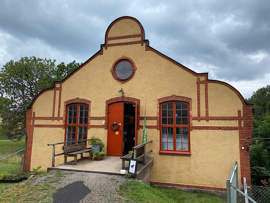 Der Renner aber ist das kleine Museum, was sich hinter dem Hauptgebäude befindet. Ich trete ein. „DingDong“ macht eine Klingel und ein kleines Männchen erscheint. Etwas ungepflegt der Bart, die Kleidung und diese Zääähne… aber freundlich zum Steinerweichen. Und dann fange ich an, das ganze Setting zu mögen. Detailreich, mit drehbaren Dreieckszylindern versehen, auf jeder Seite die Erklärung in einer anderen Sprachen (Schwedisch/Englisch/Deutsch), werden alle Objekte erklärt. QR-Codes verweisen auf selbstgemachte Youtube-Audio-Guides in ebendiesen Sprachen. Außerdem gibt es laminierte Hefte, die auf der jeweiligen Vorderseite die Fakten in 60 Sekunden lesbar erklären, auf der Rückseite die Vertiefung des Themas anbieten. Und immer das Männchen in gut verständlichem Englisch: Er würde mir bei jeder Frage behilflich sein.