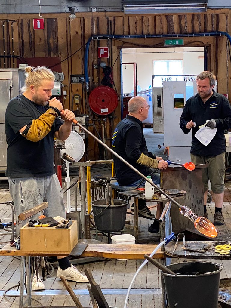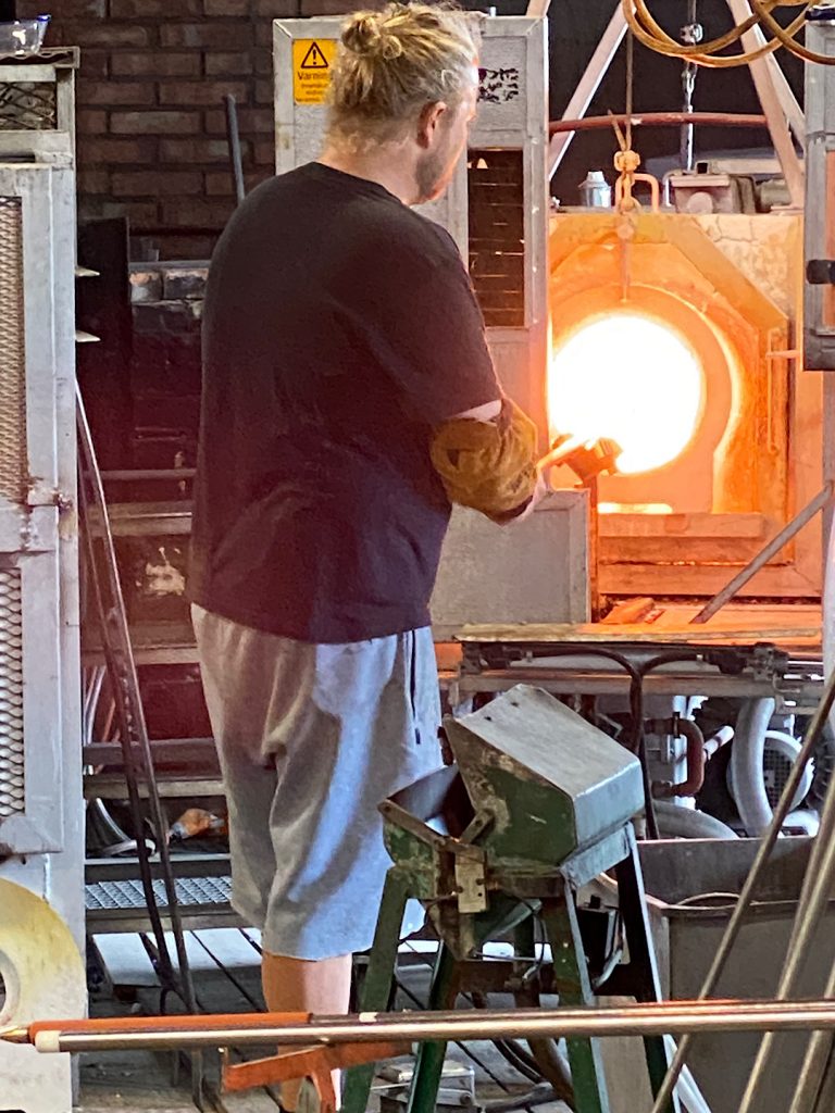Wenige Zuschauer haben in der Werksatt auf den fünf alten Stühlen Platz genommen, um dem traditionsreichen Handwerk zuzuschauen. Auch ich verfolge gebannt, wie sich die glutheißen Glasklumpen verformen lassen.