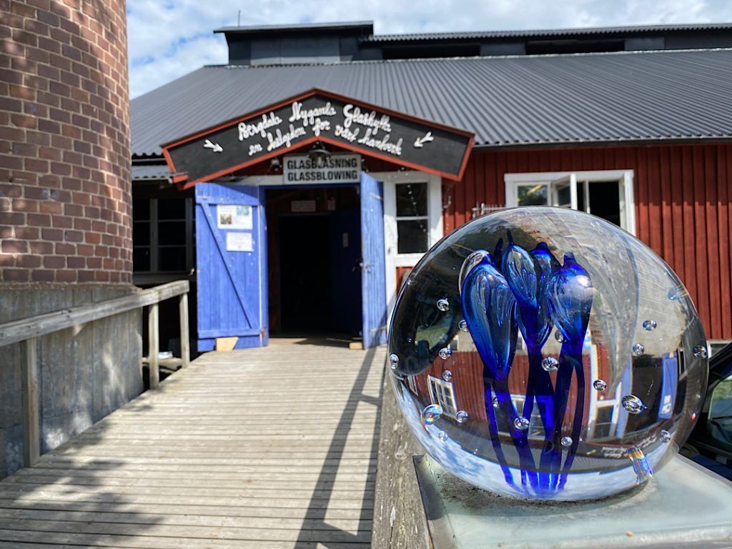 Mein nächstes Ziel ist die Glasbläserei in Bergdala. Nach 10km auf einspuriger Straße durch den Wald, ab und zu aufblitzenden rot-weißen Holzhäusern ohne Garten oder Zaun, sodass man gar nicht weiß, wie weit man Rasen mähen soll, zeigt mein Navi: „Bergdala Zentrum – 60m“. Hä? Einen Ort(!) mit Glasbläser-Werkstatt hatte ich mir anders vorgestellt. Das hier ist alles: