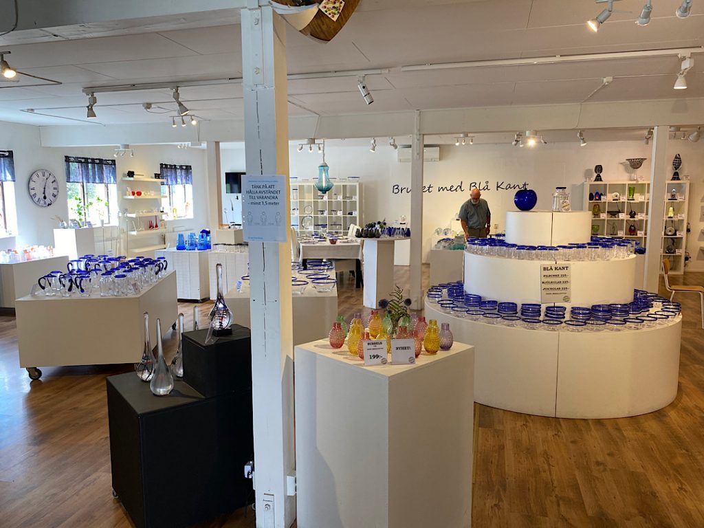 Ein Blick auf den Plan verrät, dass sie um die Glasbläserei herumgebaut wurde. Gern würde ich auch hier noch einmal den Glasbläsern bei der Arbeit zuschauen, aber man braucht Tickets, die gibts im Internet und für heute ist alles ausgebucht… okay, mein Favorit steht fest. Dieser Massenauflauf hier ist es jedenfalls nicht. Außerdem muss ich feststellen, dass mir der angebotene bunte Glaskitsch hier sowieso nicht gefällt. Handarbeit hin oder her! Nur die Kannen mit dem schlichten blauen Rand in Bergdala fand ich toll – aber nicht für 90,-€.