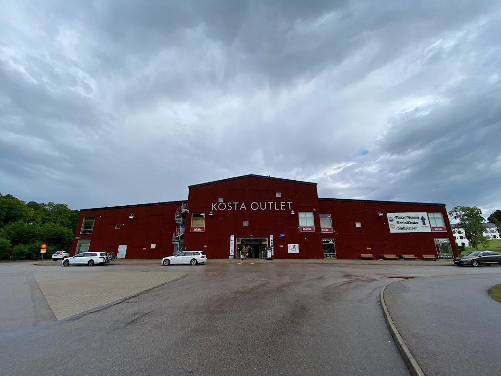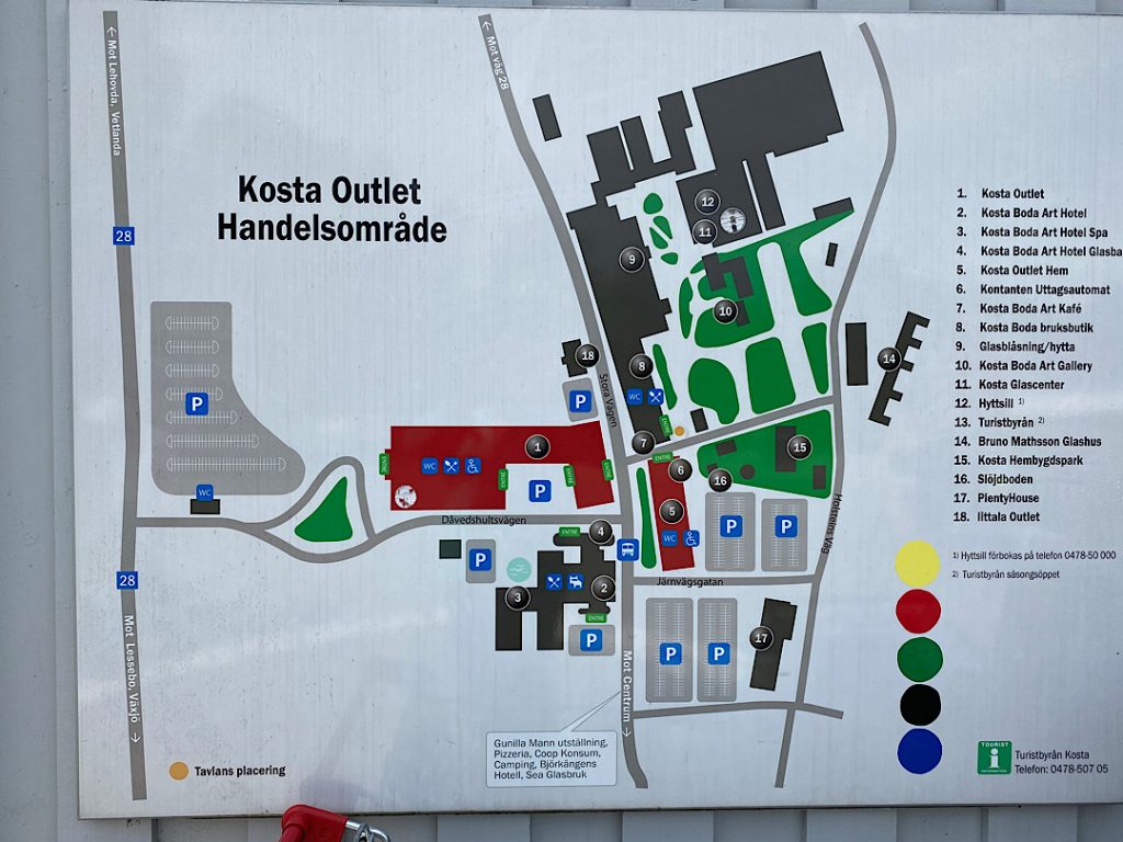 Ach komm, denk ich mir, eine geht noch. Vielleicht kann man noch ein Kleinod der Glasbläserkunst entdecken. Kosta ist der nächste Stopp im Glasreich. Ein riesiger Parkplatz, vollgestopft mit PKW und Womos empfängt mich vor dem Werksgebäude. Und wie auf Kommando geht ein Platzregen hernieder und so mache ich erst einmal Mittagspause. Als die Sonne wieder scheint, marschiere ich los und wundere mich schon über das Wort „Outlet“ über dem Eingang… Glas-Outlet vielleicht? Weit gefehlt – ich trete ein und stehe in einer … Einkaufsmeile… was soll ich denn hier???