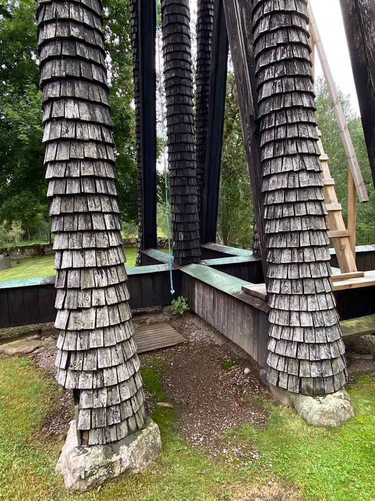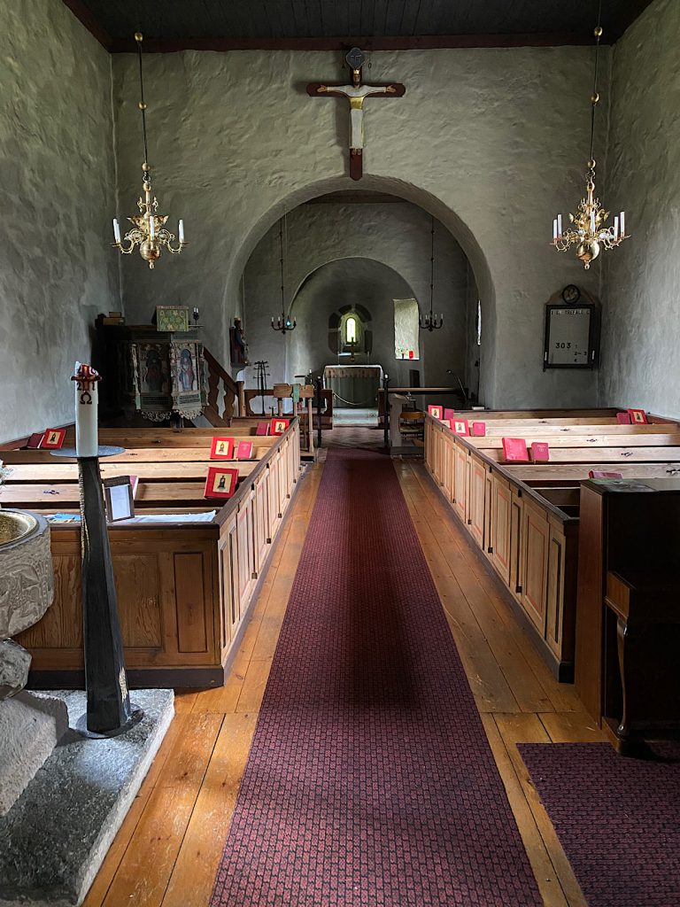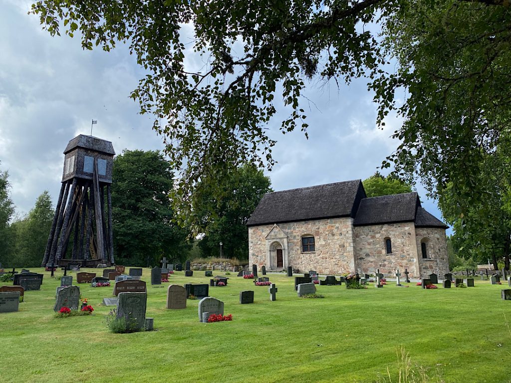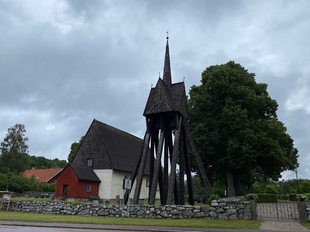 Es ist 19:00Uhr. Noch ca. 70km bis Jönköping, da steht rechts ein kleines Schild „Kerk“ und ein Rastplatz-Zeichen. Ich biege ab… und werde belohnt. Ein wunderschöner, komplett leerer und stiller Rastplatz neben einem niedlichen Kirchlein. Dazu lässt sich sogar die Sonne ab und zu blicken und verschönert den Abend. Ich drehe eine Runde über den Kirchhof und da steht genau die gleiche Art Glockenturm, wie im Dörfchen heute morgen. Gar nicht seltsam also, sondern völlig normal. Und an ihm, der „Strick der Versuchung“… ich würde ja so gerne mal, aber wenn dann alle von mir eine Predigt erwarten… da lass ich mal lieber die Finger von. Morgen 08:30 ist sowieso Gottesdienst, da komm ich vielleicht noch in den Läutgenuss.