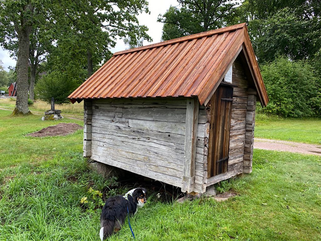 Das alles geschieht in Växjö in der „Samarkand“-Mall – herrlicher Name, aber wie auf einem Basar in Samarkand sieht es in dieser Hochglanz-Mall nicht aus. Auf dem Weg dahin finde ich zufällig ein kleines Unikat in Braå. Da stehen am Wegesrand lauter kleine, alte Häuschen, gleich dahinter ein See, daneben eine kleine Kirche mit seltsamem Kirchturm. (Später merke ich, dass „seltsam“ nur eine Frage des Blickwinkels ist)