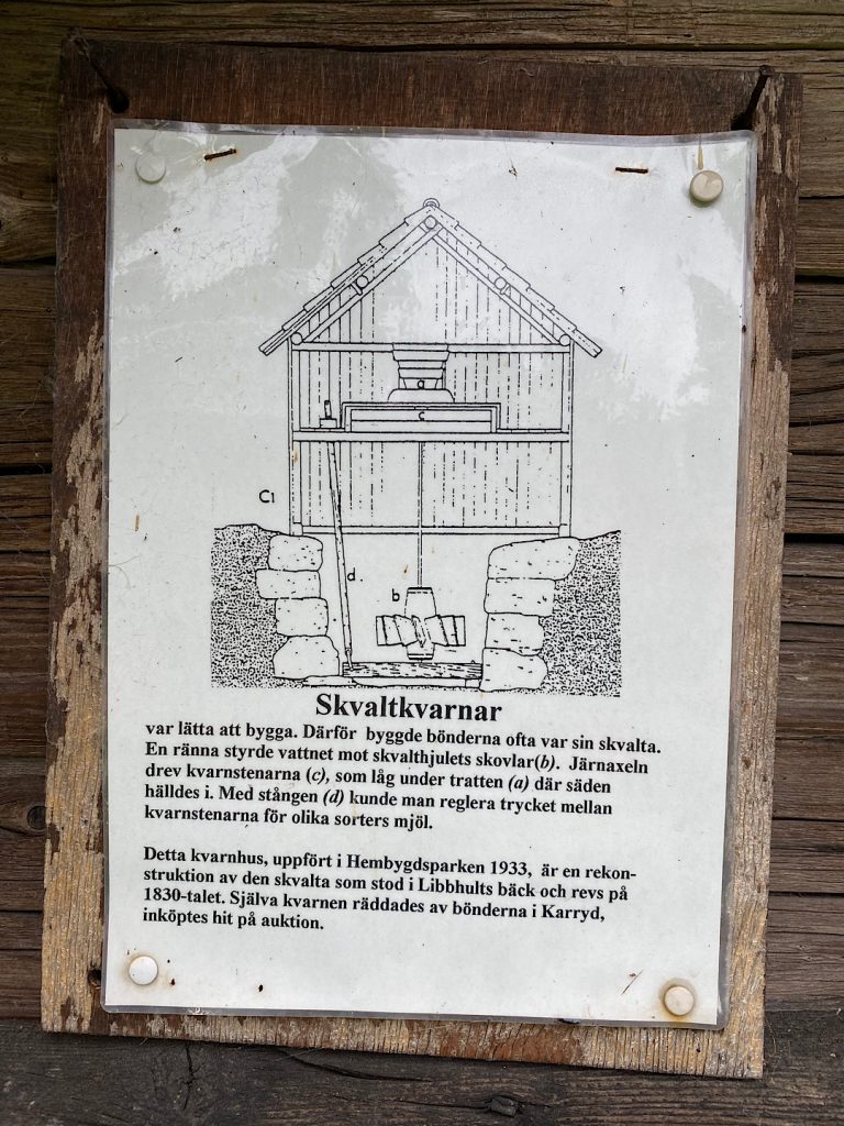 Hembygdsparken ist ein Heimatmuseum mit 20 Häusern aus dem 17.-20.Jahrhundert. Auf  Privatinitiative des Schriftsteller J.A.Göth (fast hätte es mit dem berühmten Vetter aus Weimar geklappt) ist dieses Unikat gegründet worden und wer die Innenausstattung sehen will, muss sich beim hiesigen Heimatverein melden. Es ist noch früh am Morgen und außer zwei Badegästen ist keiner vor Ort. So bummeln wir allein durch das niedliche Dörfchen. In einer Hütte liegt der Kiefer eines Blauwals, so 5-6m lang. Der Walfänger stammte von hier. Außerdem finde ich die kleinste Wassermühle, die ich je gesehen habe. Das Rad ist unten, weil das Wasser unten drunter durch fließt.