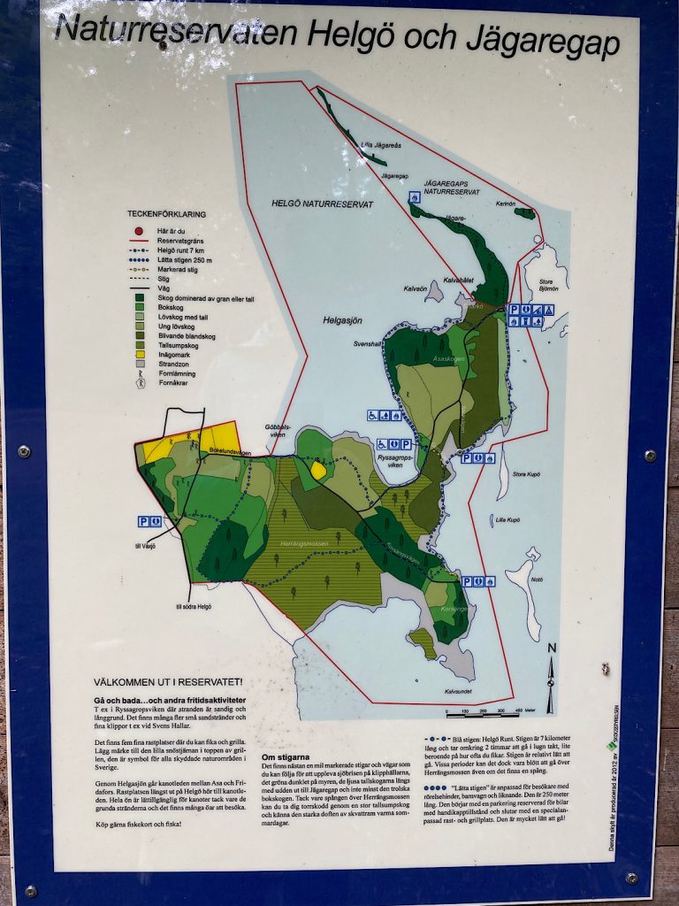 Später nehme ich das kleine Heftchen zur Hand, das ich in der Papierfabrik gefunden hatte. Über 100 Naturreservate der Umgebung sind darin beschrieben und eines ist hier ganz in der Nähe: das Naturreservat Helgö.