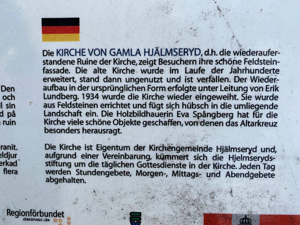 Am Eingang zum Kirchhof ein verblichenes Schild. Man kann sich nach Anruf einer Mobilnummer einen Audioguides vorlesen lassen. Und daneben eine große Tafel mit vielen weiteren kleinen altertümlichen Gebäuden, Grabfeldern und Kirchen. Auch eine Quelle ist dabei. Natürlich wird das Kirchlein ebenfalls kurz beschrieben.