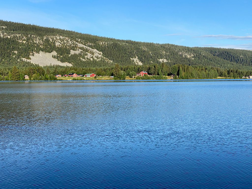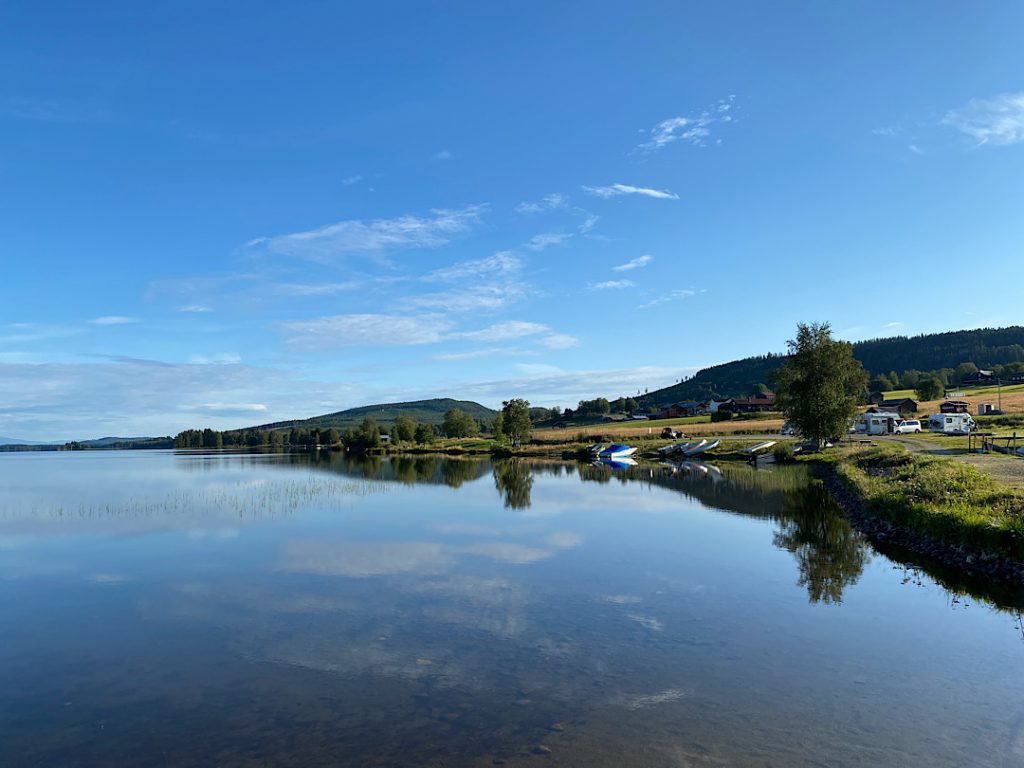 Ich laufe mit Luna am Klövsjö-See entlang, der glatt wie ein Spiegel vor mir liegt. Die anderen 3 Womos sind noch fest geschlossen nichts regt sich – wir sind allein.