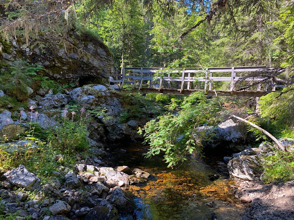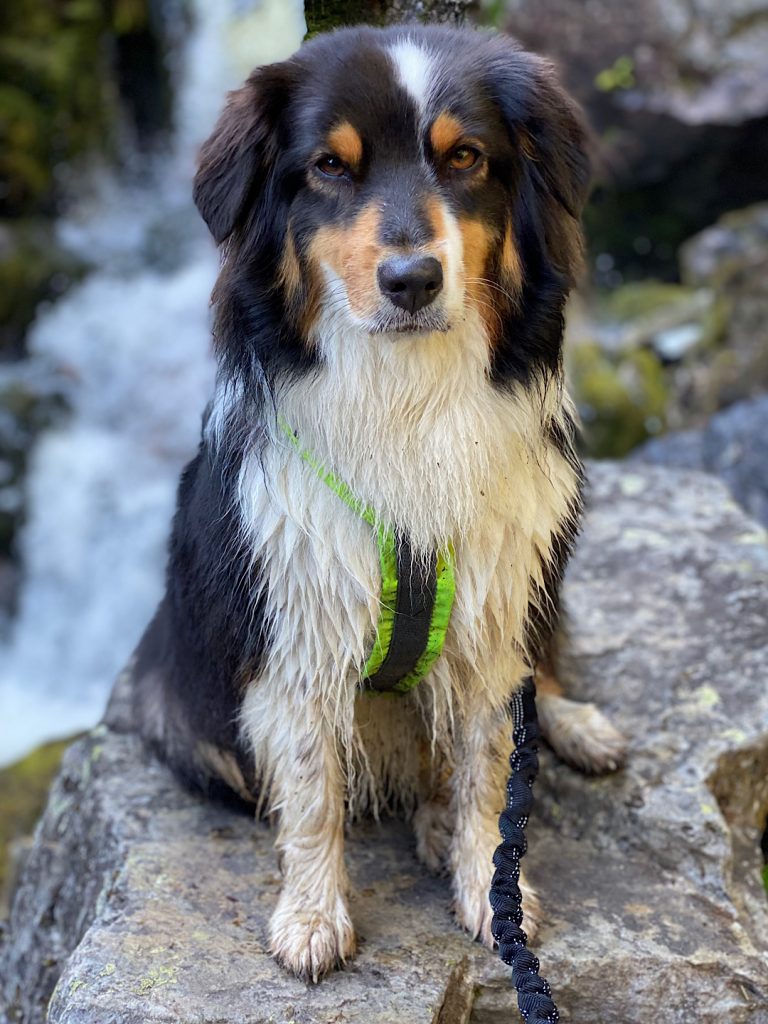 Vom eintönigen Wanderweg wandelt sich das Gelände schnell in einen hübschen Weg neben einem Bach und bald nähern wir uns dem Fall. Da ist dann schon mehr Gewusel und auch einige Leute mit Hunden versuchen sich und die angeleinten Tiere heil über die Steine zu balancieren, ohne irgendwelche Hundekonflikte zu provozieren, denn an manchen Stellen ist es ziemlich eng. Für meine Bilder allerdings kann ich warten, bis es schön aussieht 😃