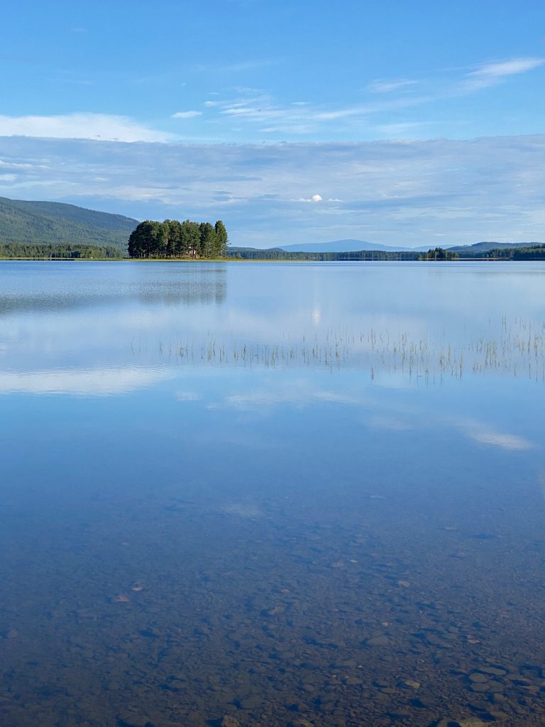 Diese Stimmung finde ich wunderbar. Luna kann schnüffeln, keine Leine weist ihr den Weg. Freudig hüpft sie mir immer wieder hinterher und stupst mich leise an, so als wolle sie sagen: „Bin wieder da.“ Hinten im See eine kleine Insel und scheinbar ist zwischen den Bäumen ein Kirchlein versteckt. Ich hole meinen Badeanzug und wage ein paar Schwimmzüge… aber mein Körper will sich an die Klönsjökälte nicht gewöhnen. Wach bin ich jedenfalls.