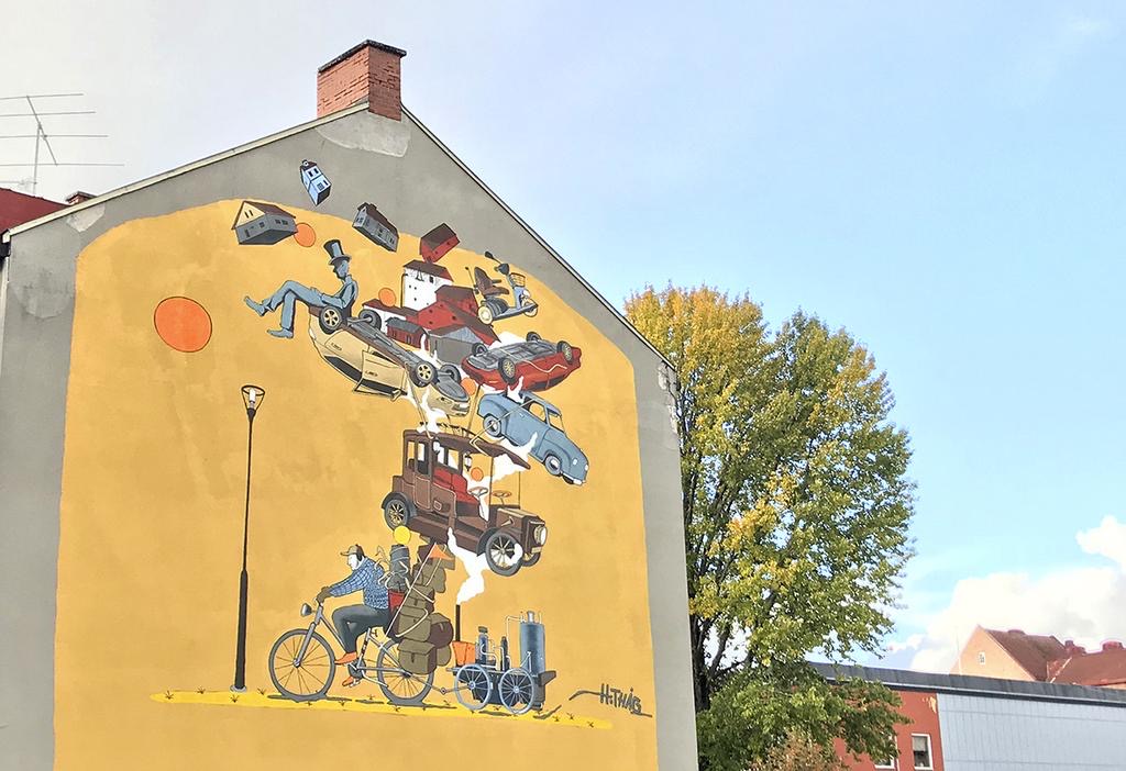Gestern fuhr ich an einem bemalten Haus vorbei, das hatte ich schon einmal gesehen. Erst da merkte ich, dass Filppstad der Kreuzungspunkt meiner Reise ist. Auch auf dem Bild ist jemand unterwegs, allerdings auf dem Fahrrad. Die genaue Aussageabsicht des Künstlers kann ich zwar nicht deuten, aber für mich ist das Bild auch ein bisschen ein Symbol meiner Reise geworden und ich hab mich sehr gefreut es wiederzusehen, so wie einen alten Bekannten 😉 . Mitten auf der Kreuzung anhalten und ein Bild machen, das war nun wirklich nicht drin, aber das Internet findet alles 🙂