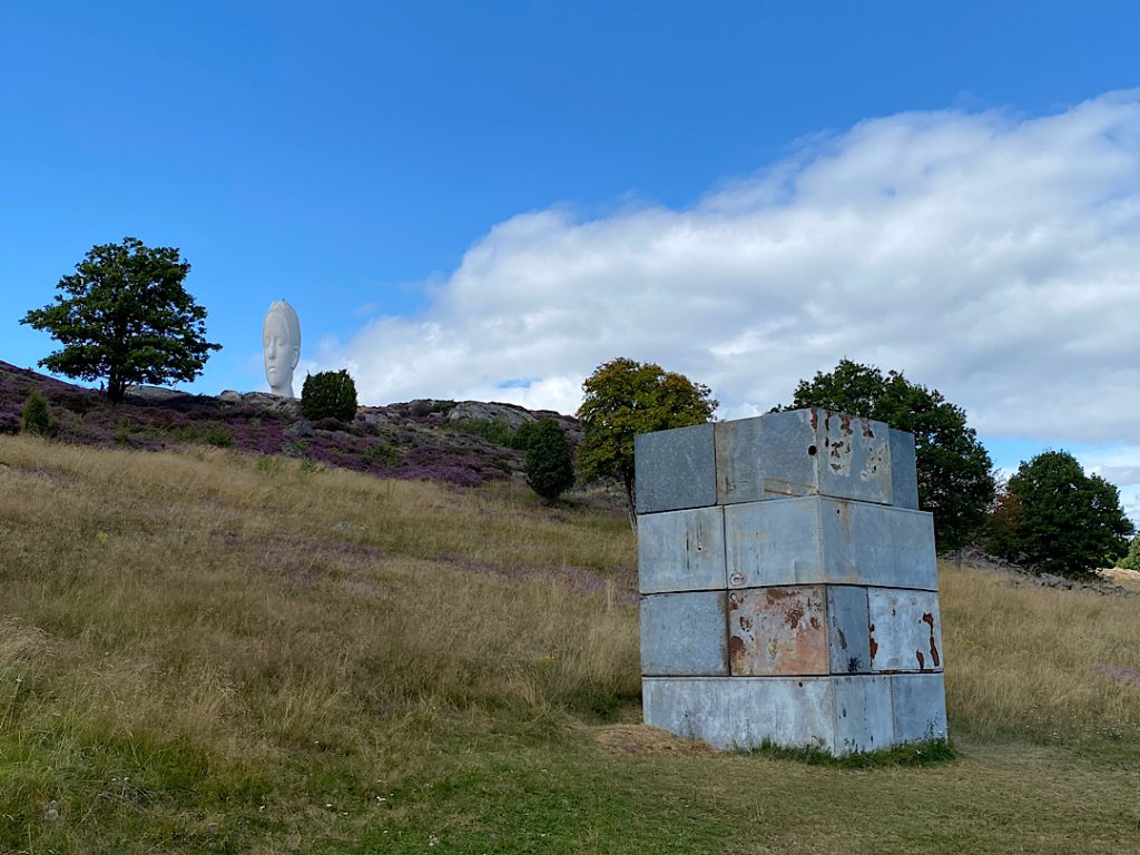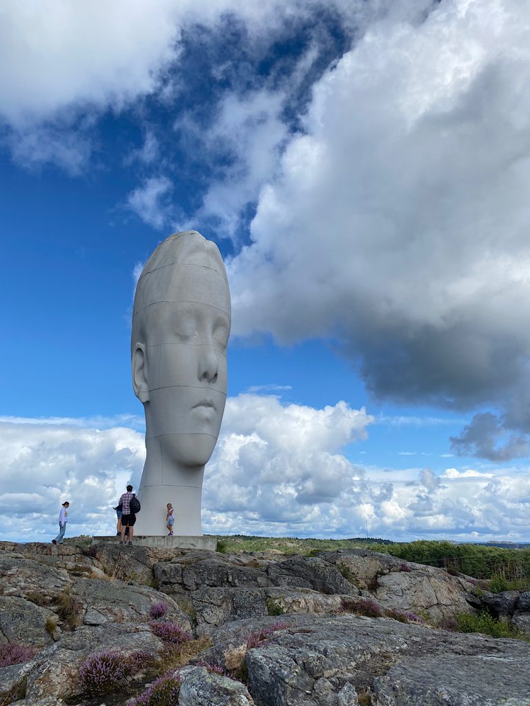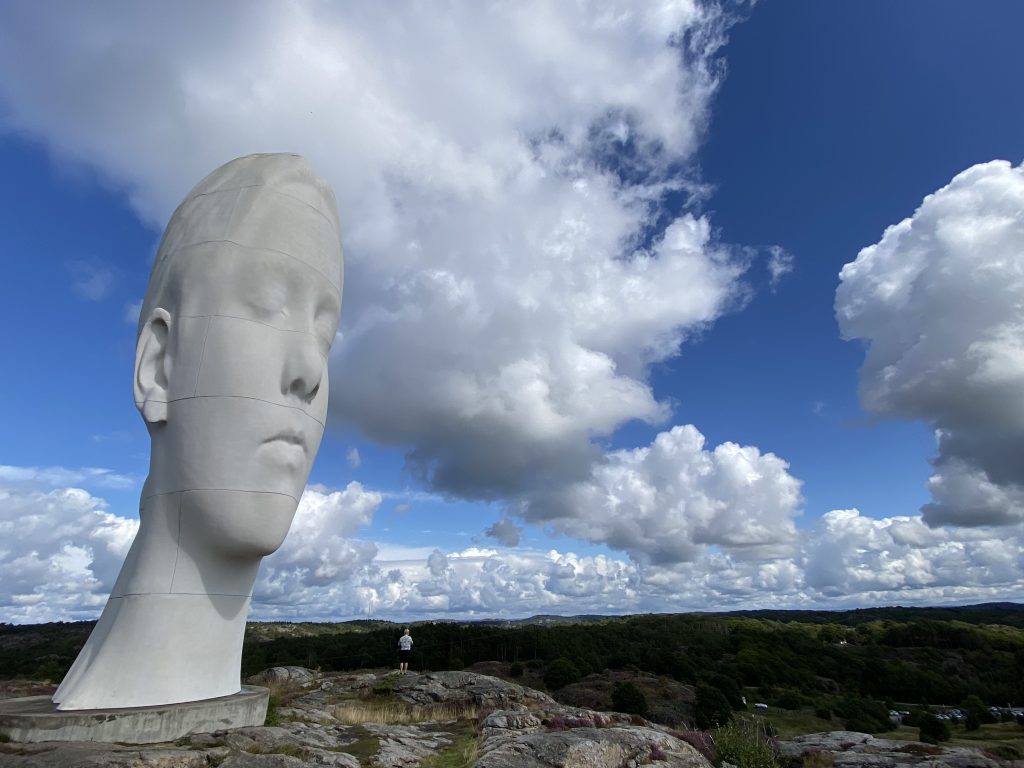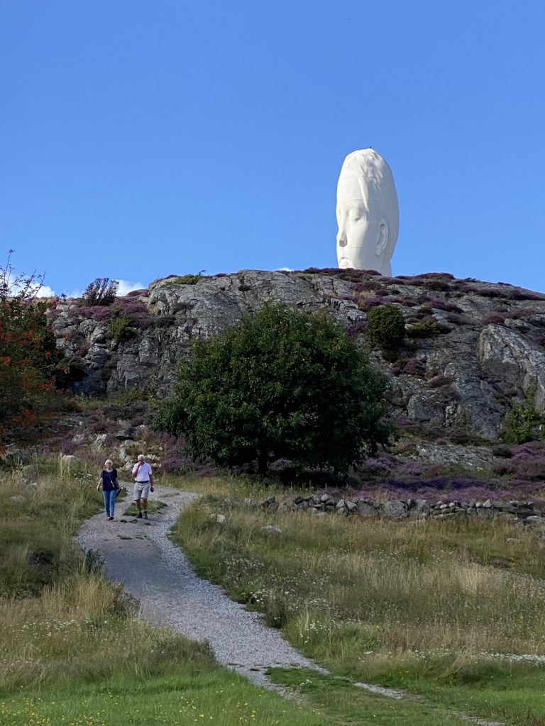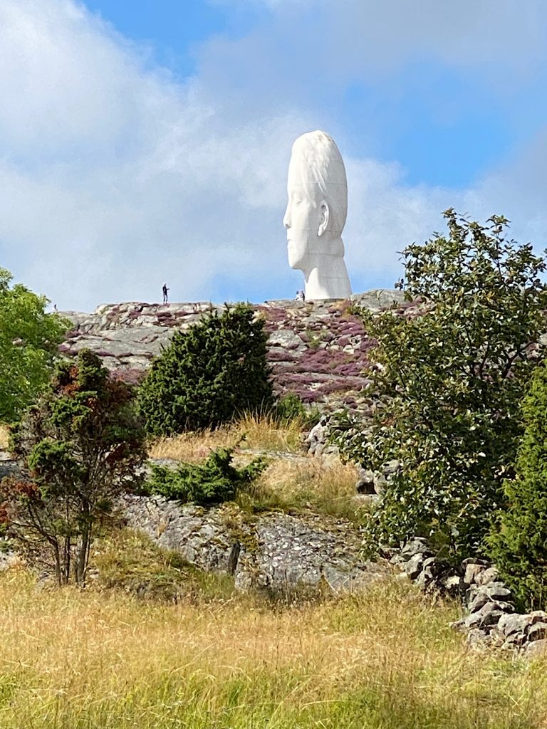 Und da treffe ich – meine liebe Passion for Gospel Gabi – dein Abbild in schwedisch. Der Hammer, die Frau hat mich so an dich erinnert: ähnliches Alter, perfekter Kurzhaarschnitt, sehr, sehr gepflegt, ausgesucht gekleidet, groß, schlank und ausnehmend freundlich. Allerdings mit Dackel, den hast du ja nicht 😉 Sofort kommen wir ins Gespräch und sie erzählt mir im perfekten Englisch, das ich den Skulpturenpark in Pilane auf keinen Fall verpassen dürfte. Gar nicht weit weg von hier, open air, auf einem ehemaligen prähistorischen Grabfeld und wunderschön. Die Hauptfigur „Anna“ steht immer da, alle anderen Kunstwerke wechseln. Ich bin sofort begeistert und frage sie noch, ob es sich lohnen würde hinüber nach „Skärhamn-City“ zu fahren, aber sie schüttelt den Kopf. Da solle ich doch lieber noch einen Stopp in Sundsby säteri einlegen. Da bin ich vorhin vorbeigekommen, es sah nett aus, aber ich bin vorbei gefahren. Super! Zwei neue Ideen für den Tag und persönliche Empfehlung einer schwedischen Gabi, die können doch nur wunderbar sein!!!