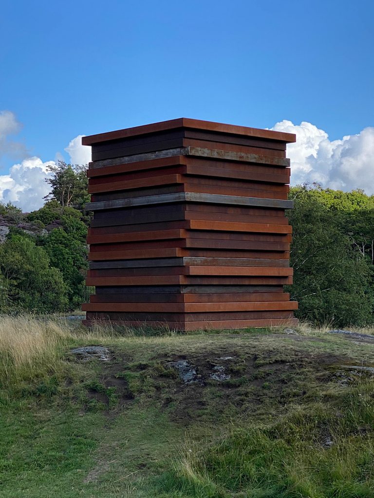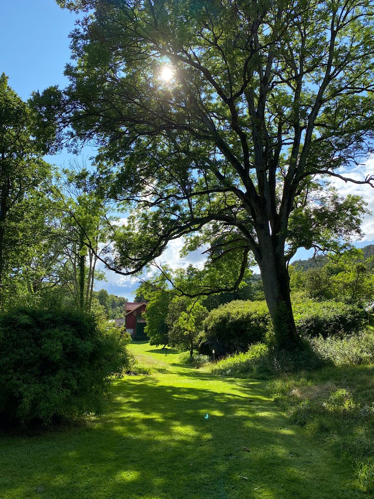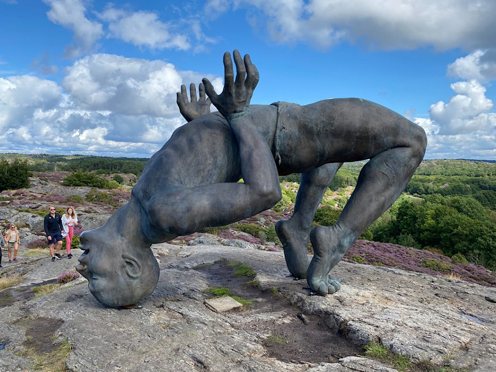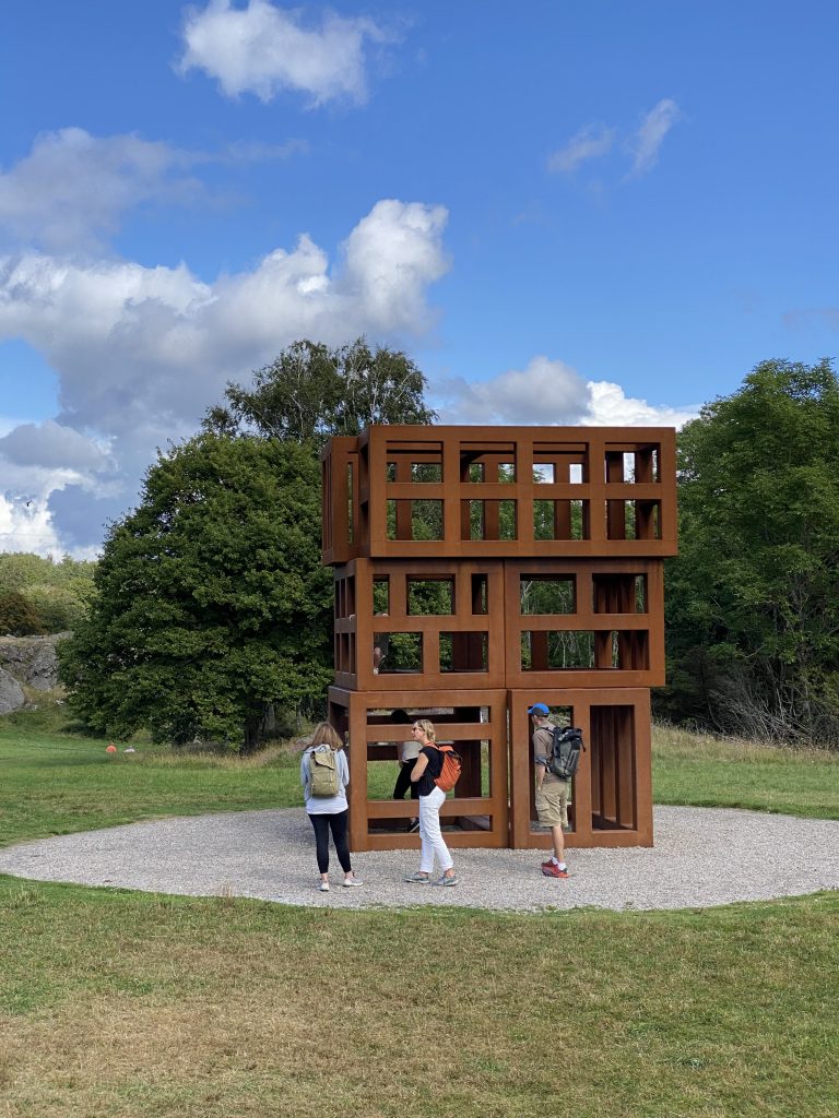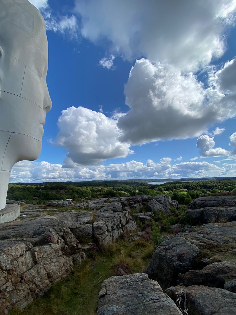 Und da treffe ich – meine liebe Passion for Gospel Gabi – dein Abbild in schwedisch. Der Hammer, die Frau hat mich so an dich erinnert: ähnliches Alter, perfekter Kurzhaarschnitt, sehr, sehr gepflegt, ausgesucht gekleidet, groß, schlank und ausnehmend freundlich. Allerdings mit Dackel, den hast du ja nicht 😉 Sofort kommen wir ins Gespräch und sie erzählt mir im perfekten Englisch, das ich den Skulpturenpark in Pilane auf keinen Fall verpassen dürfte. Gar nicht weit weg von hier, open air, auf einem ehemaligen prähistorischen Grabfeld und wunderschön. Die Hauptfigur „Anna“ steht immer da, alle anderen Kunstwerke wechseln. Ich bin sofort begeistert und frage sie noch, ob es sich lohnen würde hinüber nach „Skärhamn-City“ zu fahren, aber sie schüttelt den Kopf. Da solle ich doch lieber noch einen Stopp in Sundsby säteri einlegen. Da bin ich vorhin vorbeigekommen, es sah nett aus, aber ich bin vorbei gefahren. Super! Zwei neue Ideen für den Tag und persönliche Empfehlung einer schwedischen Gabi, die können doch nur wunderbar sein!!!