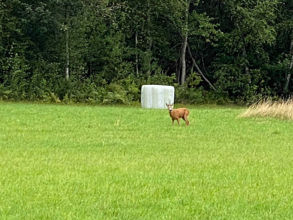 Übernachtet haben wir auf der nördlichsten und zuckeln nun gemütlich von einer Fähre zur anderen. Da sind aber zu dieser frühen Stunde auch noch Andere unterwegs. Ganz unbedarft schauen sie das Womo an und fressen dann fröhlich weiter. Den hier konnte ich von der Straße aus mal festhalten.