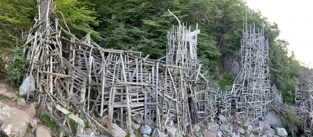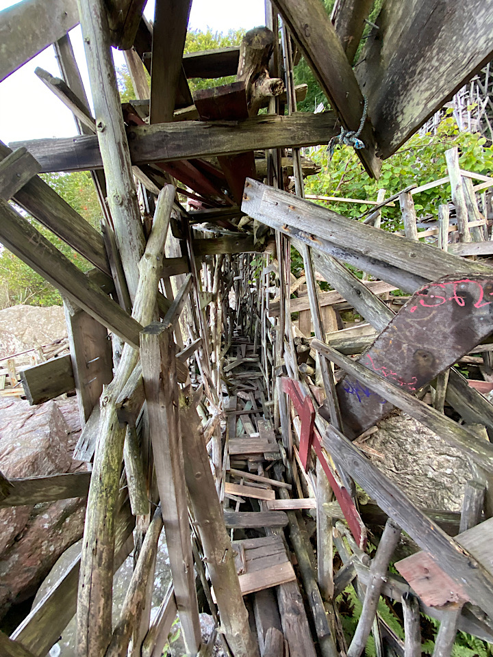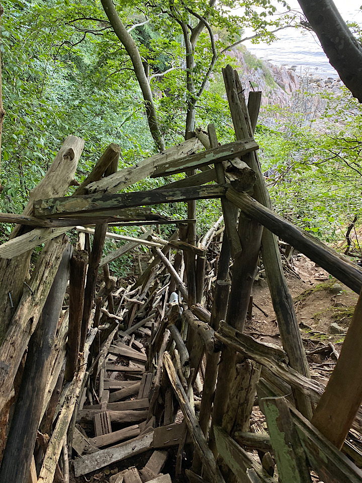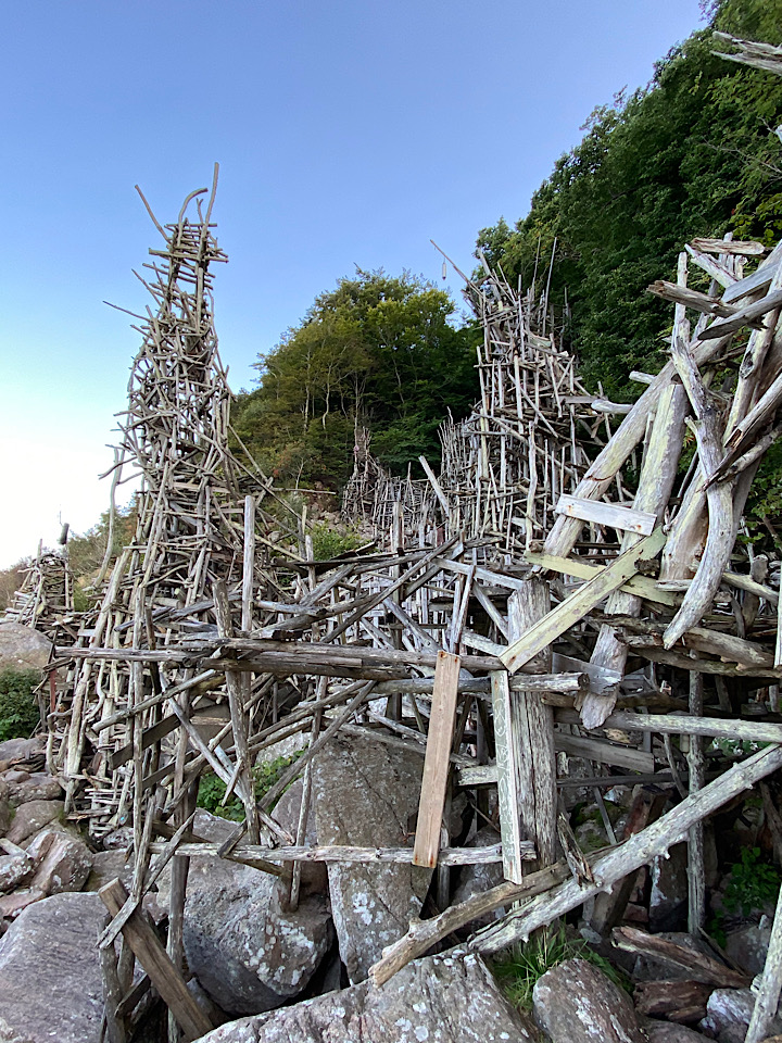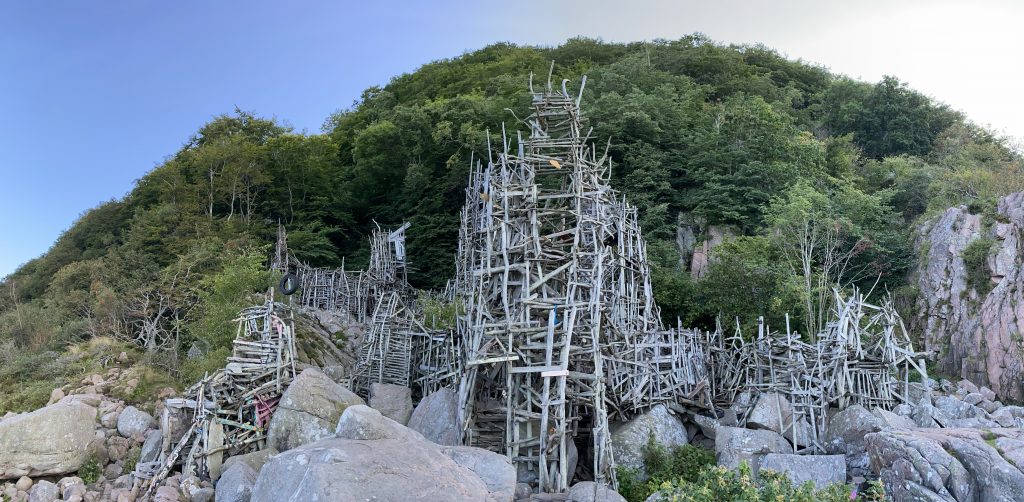Klingt lustig, ist es auch. Erfunden hat das ganze ein schwedischer Künstler. Lars Vilks rief die ladonische Republik 1996 aus und baute auch die Hauptskulpturen seines Landes. An einer recht unzugänglichen Stelle des Küstenzipfels entstand so Nimis, eine beeindruckende Treibholzskulptur, die man begehen kann. Erst ist das niemandem aufgefallen, eben weil kaum jemand an diese Stelle kam. Dann aber gab es verschiedenerlei Stress. Schon mehrfach fiel Nimis Brandstiftungen zum Opfer, die Behörden wollten es als nicht genehmigtes Gebäude im Naturschutzgebiet abreißen lassen und auch offizielle Hinweisschilder gibt es nicht. Braucht es auch nicht. Folgt einfach den Spuren und zieht gutes Schuhwerk an.