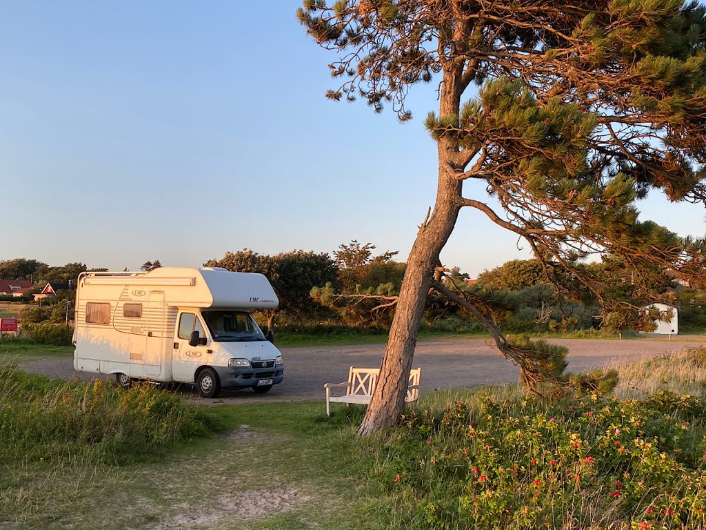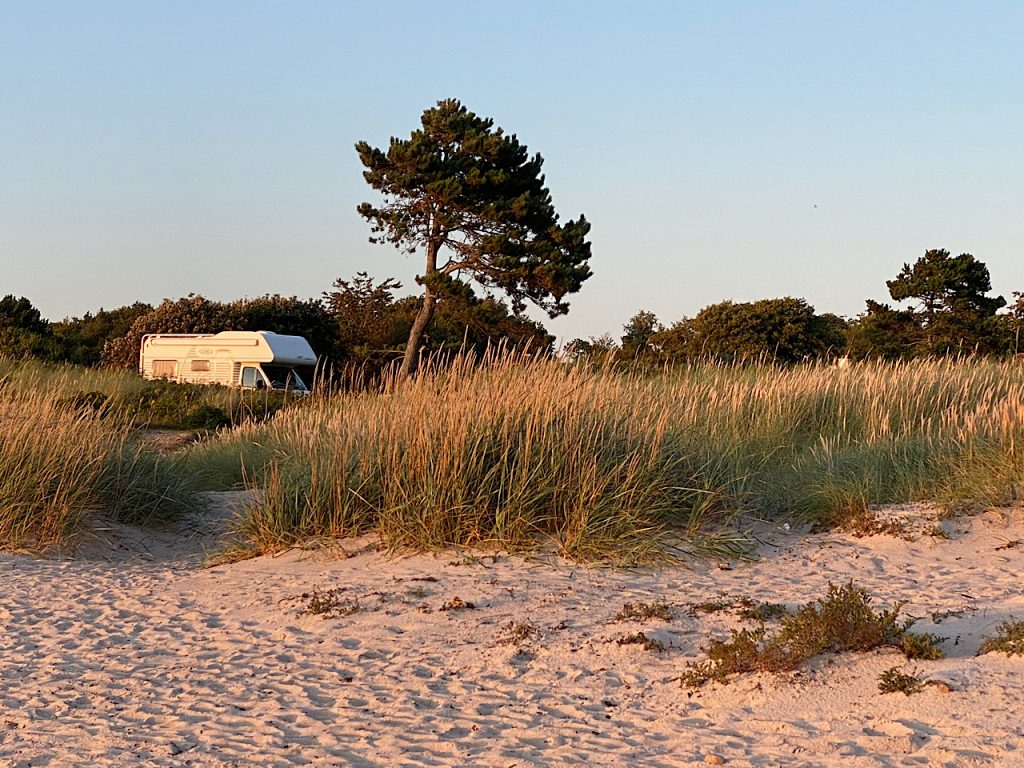 3km an der Küstenlinie entlanggeschuckelt und voila – der beste Stellplatz ever. Nur das blaue Schild vorn am Eingang (weißes Womo auf blauem Grund und darunter die Zahlen 9-22) übersehe ich einfach mal. ich bummel mit Luna noch eine Runde am Strand entlang und sie genießt beim Sonnenuntergang ihr Abendfutter als ein Mann mit Hund kommt.