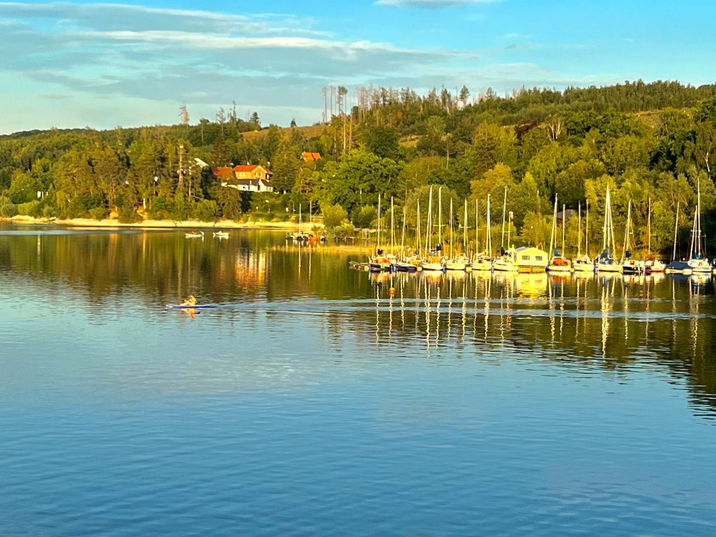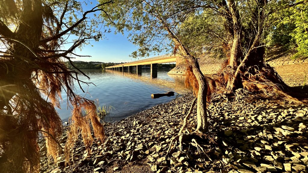 Gegen 20:00 Uhr wird es kühler und wir starten zu einem kleinen Abendspaziergang. Gleich neben dem Parkplatz gibt es eine Fußgängerbrücke über den See. Im Abendlicht genießt junges Volk die Stimmung am See und ein bisschen kommt Schwedenfeeling auf.