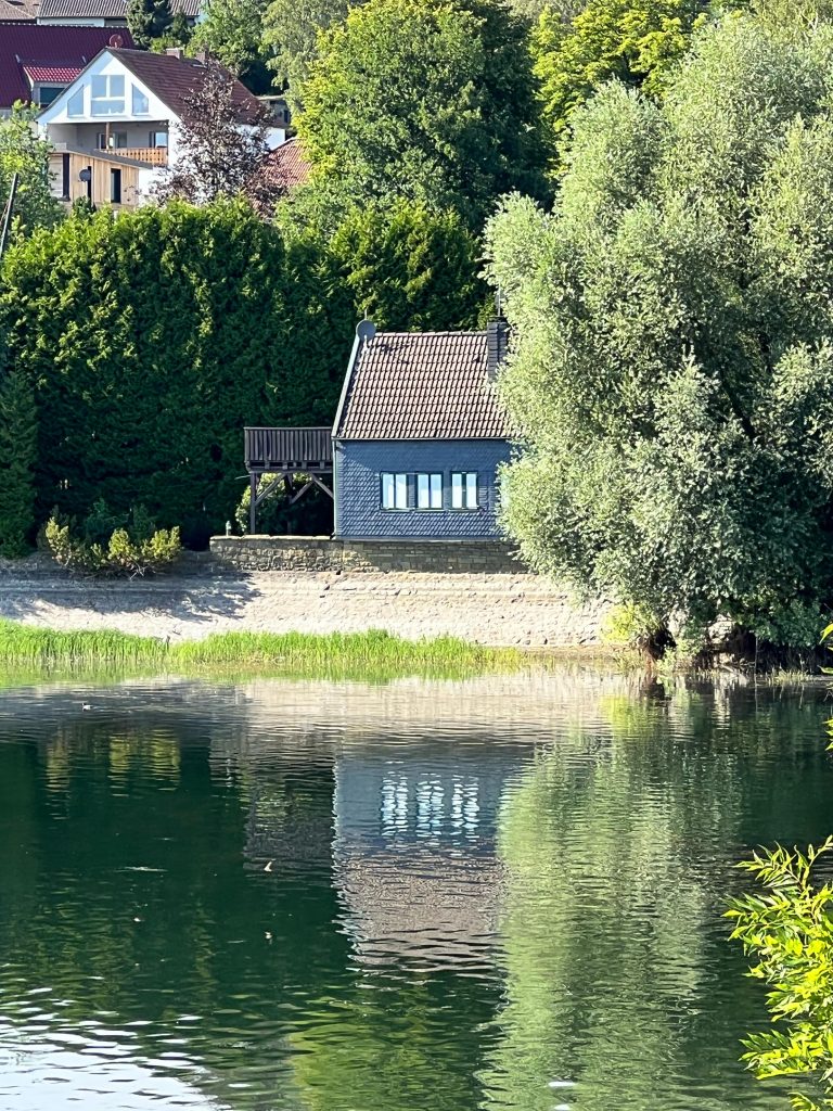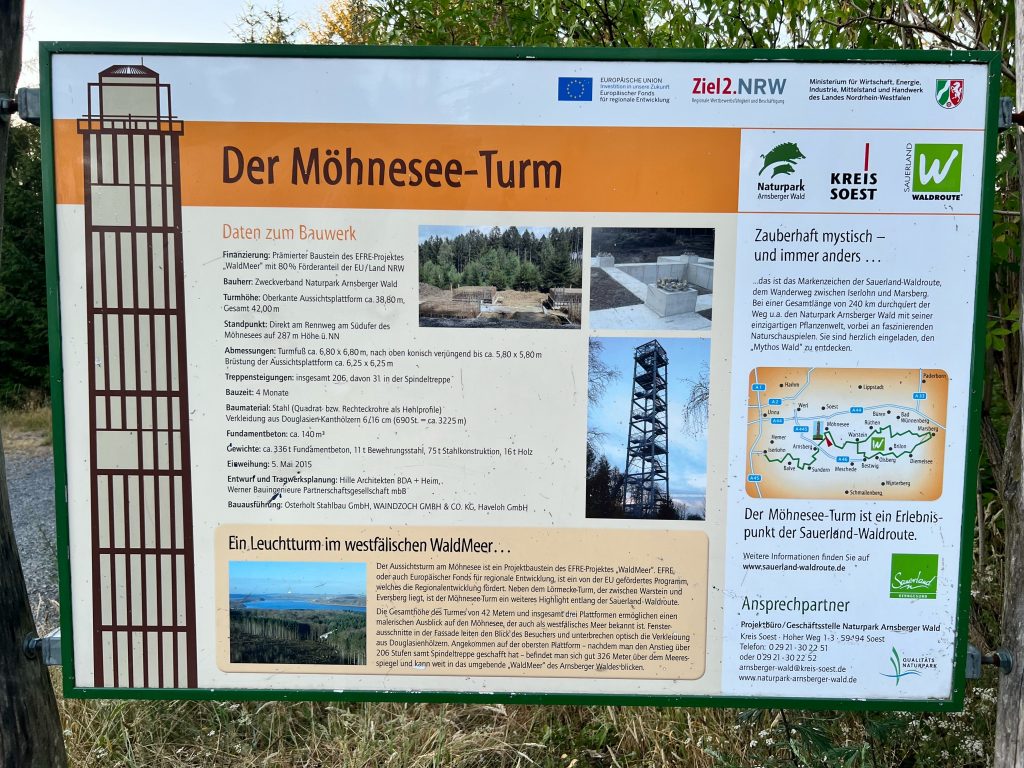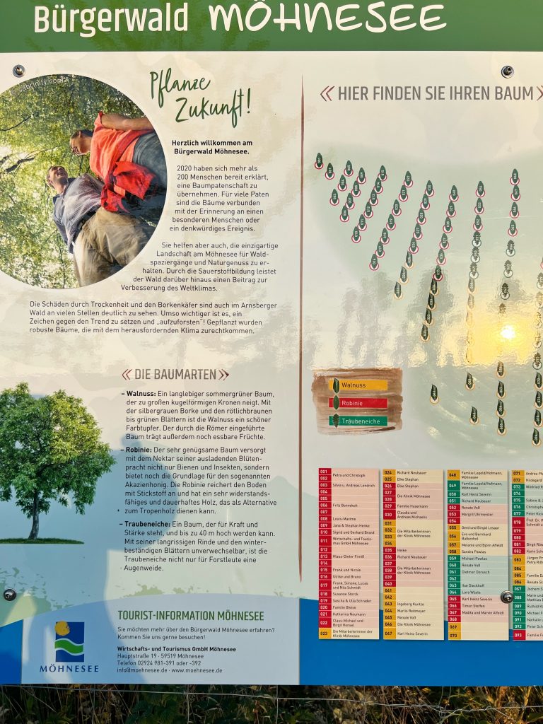 Gegen 15:00 blitzt der Mönichsee durch die Bäume. Die zu ihrer Entstehungszeit 1913 größte Stauanlage Europas galt im 2. Weltkrieg als Wasserspeicher des Ruhrgebiets. Um die deutsche Wehrmacht empfindlich zu treffen, entwickelten die Briten extra Rollbomben, die in riskanten Tiefflügen über dem Wasser abgeworfen wurden. Sie hüpften dann förmlich über die Oberfläche und konnten somit den schützenden Torpedonetzen ausweichen. Im Mai 1943 traf dann wirklich eine der Bomben die Staumauer und riss ein 80m breites Loch hinein. Die 7 Meter hohe Flutwelle riss im Möhnetal alles mit, richtete sogar im 80km entfernten Ruhrgebiet noch Schäden an und forderte auch dort viele Todesopfer.