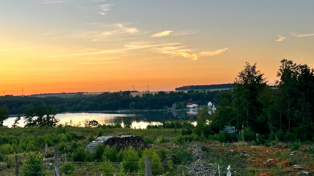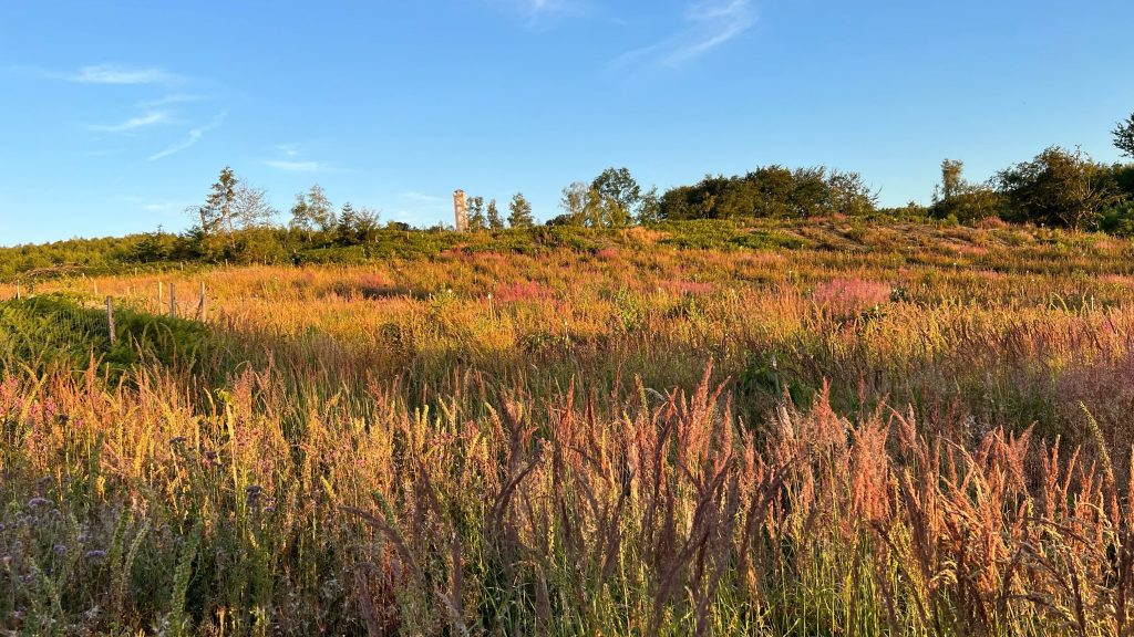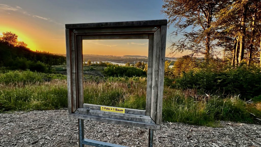 In die andere Richtung führt der Weg zum Turm. Auch hier haben die letzten Sommer ihre Spuren hinterlassen aber ein Baumpatenschaftsprojekt sorgt für Wiederaufforstung. In der Abendsonne blinkern die Schilder der Paten und auf großen Schildern sind ihre Namen vermerkt.