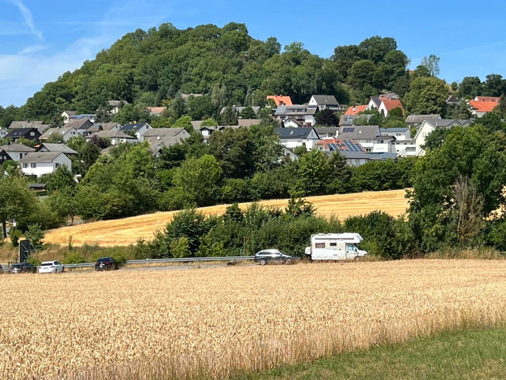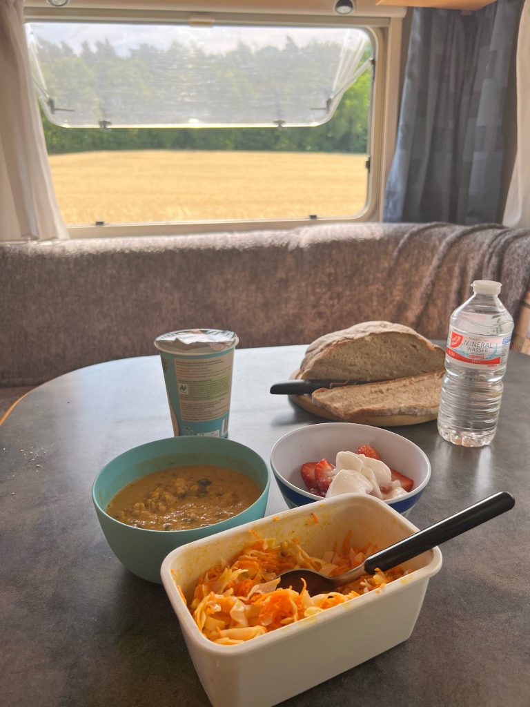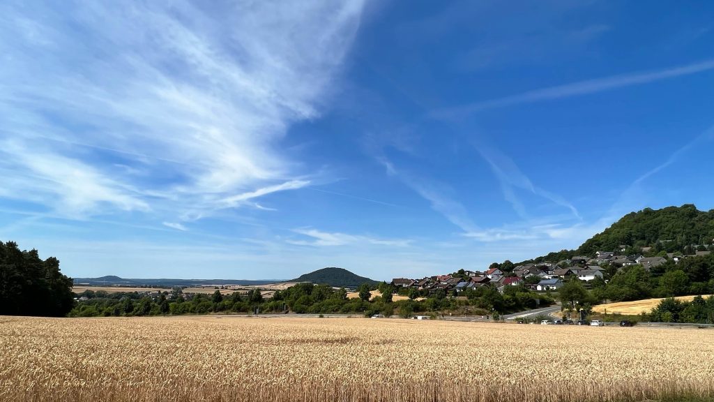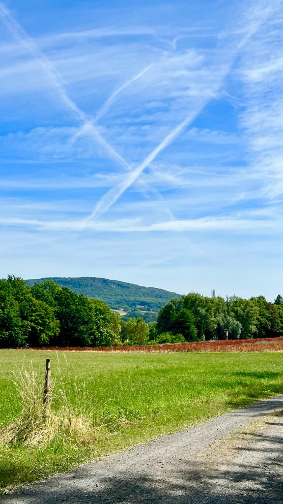 Nun lassen wir mal alles auf uns zukommen und zuckeln gemütlich die A4 in Richtung Eisenach, dann auf der B7 über die Dörfer des Hainichgebiets nach Eschwege, Kassel und weiter bis zum Mönichsee. Nette Fachwerkhäuschen und eine sommerliche Hügellandschaften säumen den Weg. Mehr als einmal würde ich ich gern anhalten, aber ich habe ja einen Plan… Doch kurz hinter Kassel gibt es dann doch einen Mittagsstopp am „Heiligen Hain“ – was für ein Name. Das ist ein kleines Naturschutzgebiet mit einem P&R Platz für Kassel-Touristen. Wir lassen uns ein Drei-Gänge-Menü schmecken (Möhrensalat, Linsendal, Erdbeeren mit Kokosyoghurt) das Brot dazu haben mir meine lieben Nachbarn noch frisch aus dem Steinofen geholt und nebst selbstgemachtem Eierlikör als Reiseproviant mitgegeben. Leeecker! Danach wandern wir um den nahegelegenen Hundsberg. Der Himmel grüßt mit der schottischen “Doppelflagge“.