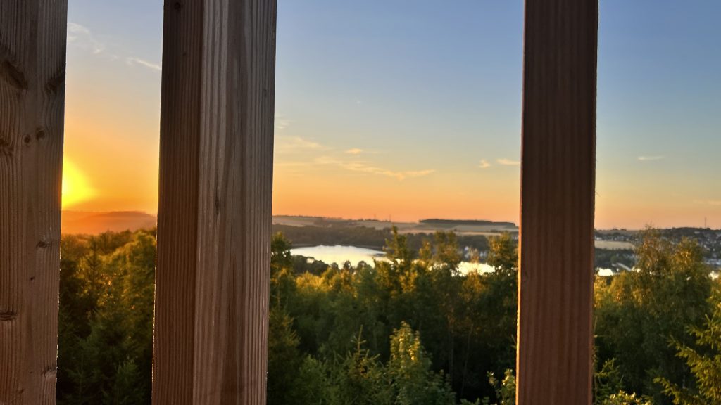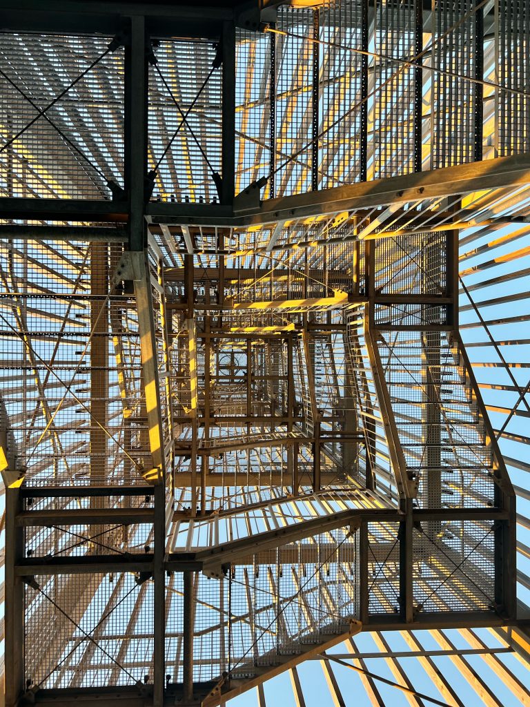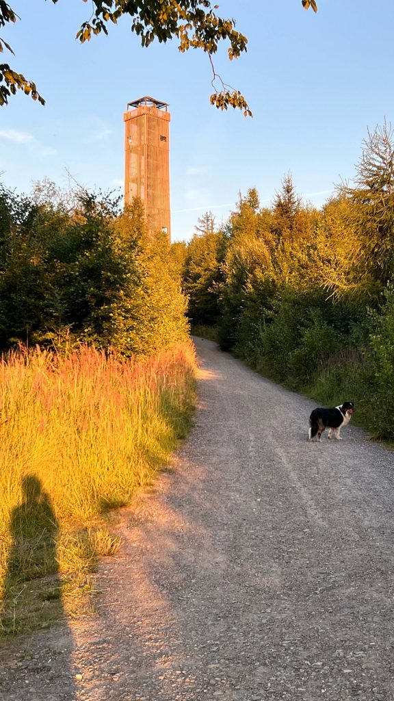 Der Turm ist für uns beide eine Herausforderung. Mit seinen Gitterstufen aktiviert er bei mir sofort den Höhenangstknopf und auch Luna traut diesem seltsamen Untergrund nicht über den Weg. Wir kehren beide um: sie nach vier Stufen – ich nach vier Treppenabsätzen. Trotzdem erhasche ich noch ein bisschen Abendstimmung durch die hölzerne Verkleidung.