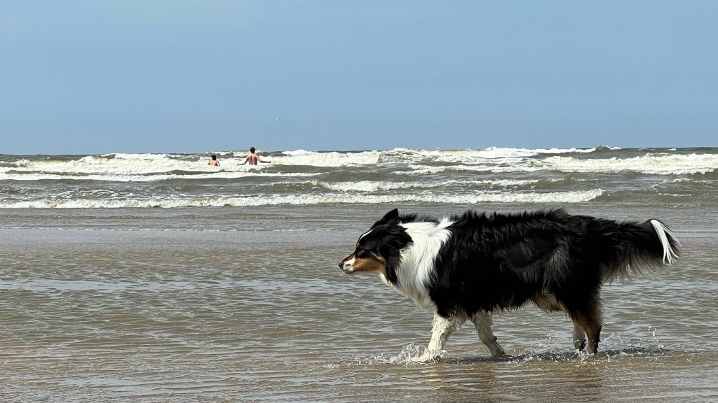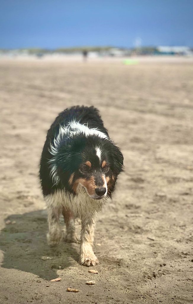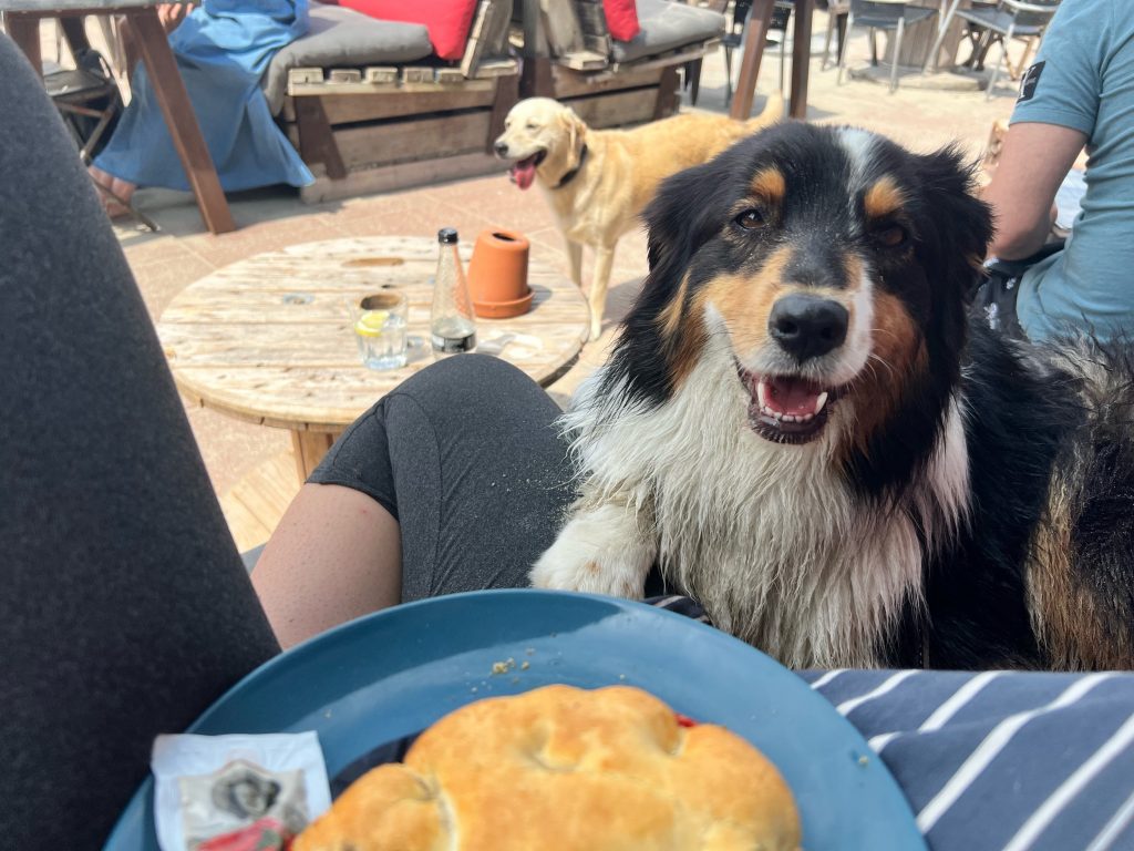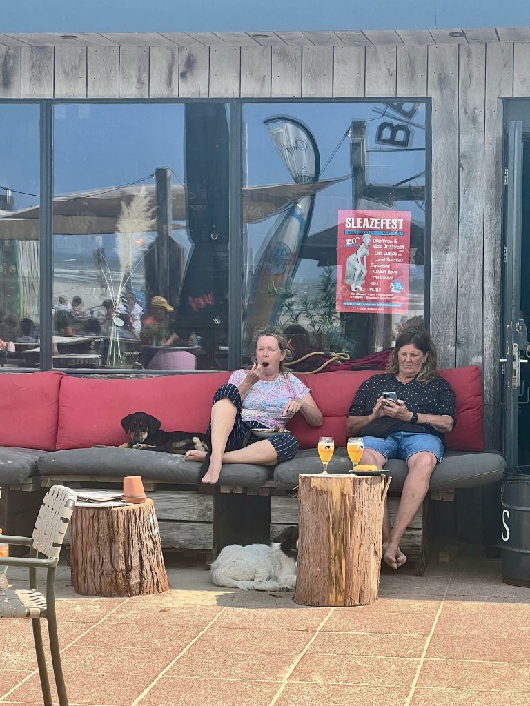 Viele Fellnasen laufen hier frei und alle Hundebegenungen sind freundlich. Die Sonne scheint, ein Lüftchen weht, Kitesurfer und Strandsegler haben ihren Spaß – und wir auch. Nach zwei Stunden lasse ich mich im Außenbereich des Strandcafes „Beach Inn“ nieder. Auch hier sind Hunde ausdrücklich willkommen… ich fasse es nicht. Sogar auf die Polster der gemütlichen Lümmelsofas dürfen sie drauf. Im Gegenzug ist hier natürlich alles nicht porentief rein, aber die Besucher kommen vom Strand und sind selbst sandgebadet. Das stört hier also keinen.