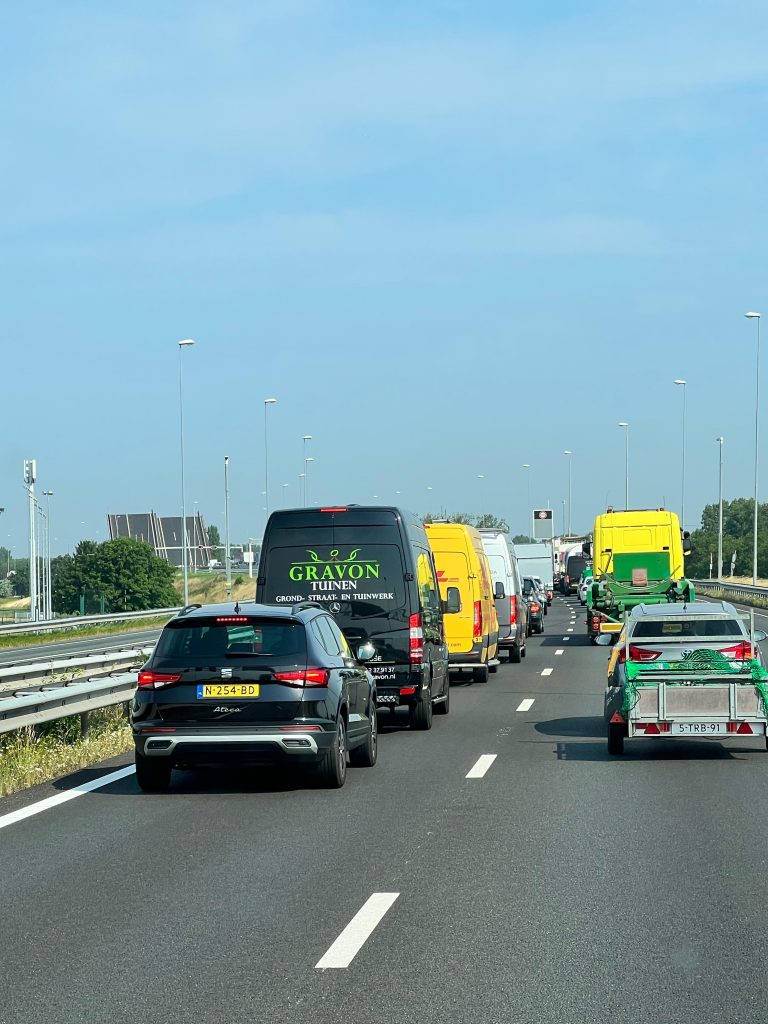 Den Weg nach IJmujden starte ich möglichst früh, denn die Mittagshitze von gestern muss ich heute nicht im Womo haben. „Ans Meer, ans Meer…“ lautet das Motto des Tages. Die Fahrt ist angenehm. Alle fahren nur 100km/h und ein einziger Stau dauert 5 Minuten. Der Grund? Die Autobahn wurde hochgeklappt. (Siehe im Bild links)