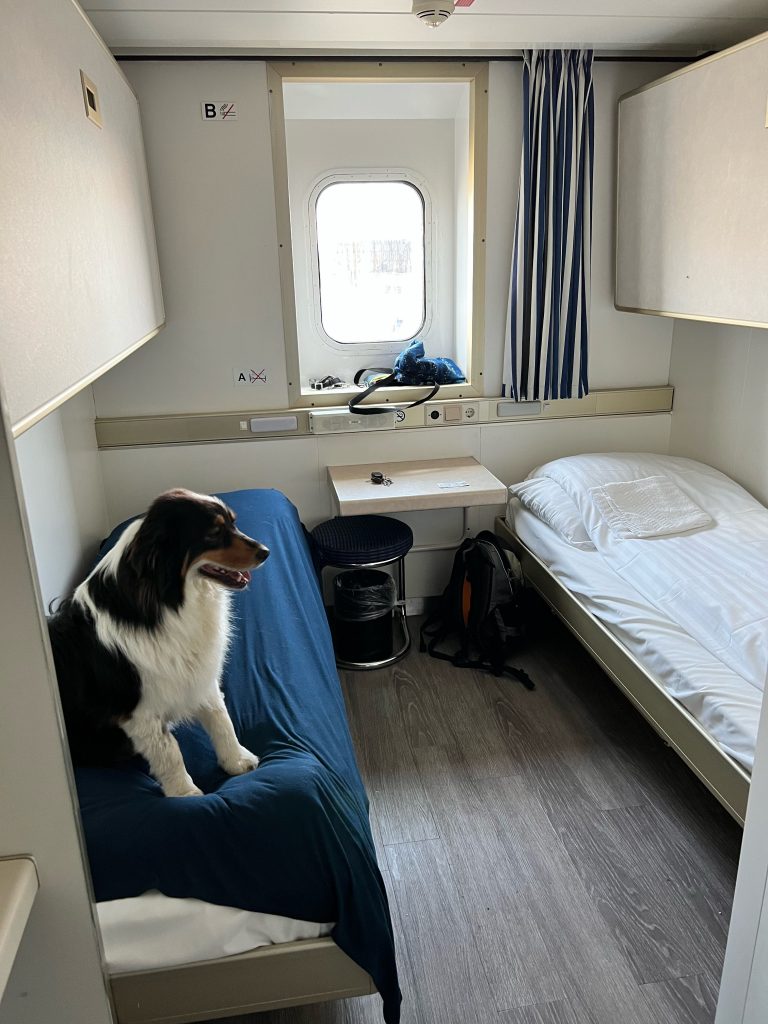 Die Kabine ist sehr klein und ich bin froh, die Klappbetten über mir an der Wand lassen zu können. Luna findet das alles ein wenig suspekt. Die Geräusche, die Gerüche, die Enge… auch der Hundeaußenbereich ist laut, eng und unkreativ… denke nicht, dass sie hier locker ihr „Geschäft“ verrichten wird. Aber ich habe sie bei mir und muss sie nicht in einem Käfig allein lassen.