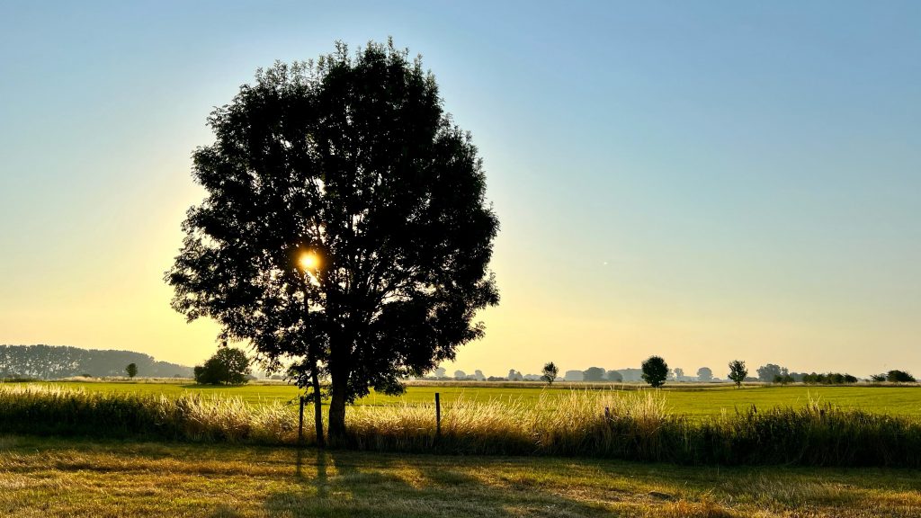 Erst gegen Mitternacht waren die Temperaturen erträglich und wir fanden erholsamen Schlaf bei offenen Fenstern und Türen. Morgens stand noch ein Van neben uns. Spät muss er angekommen sein, ich hatte ihn gar nicht gehört. Unsere morgendliche Runde starten wir in den nahe gelegenen Rheinauen. Alles ist frisch gemäht und so können wir über die in der Frühsonne schimmernden Wiesen laufen.