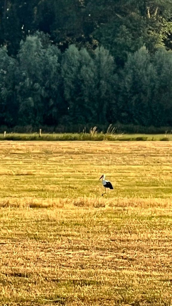 Kaum ein paar Schritte vom Dorf entfernt dreht Meister Adebar seine Runden unweit seiner Frau, die auch auf der Frühstückssuche ist.