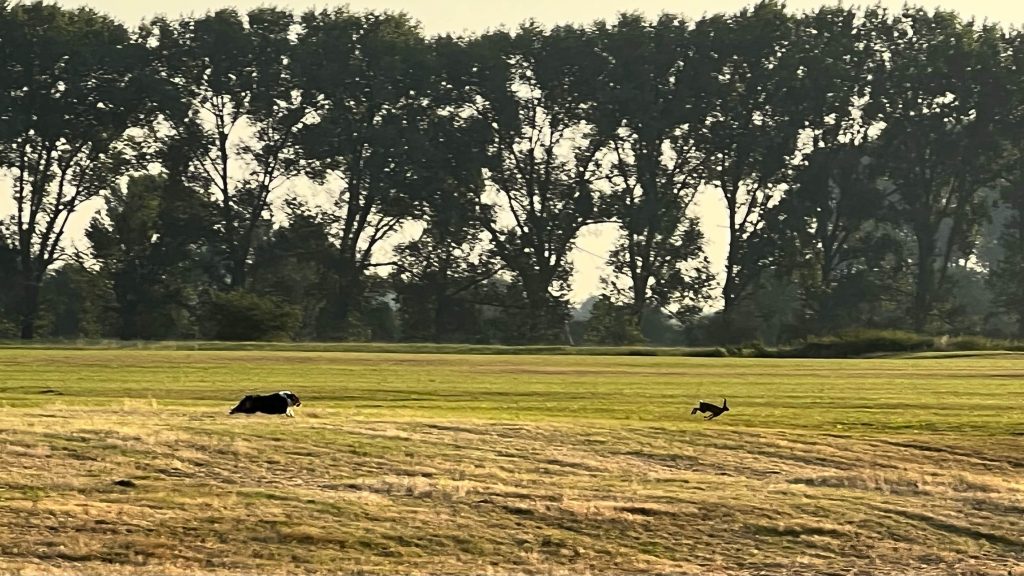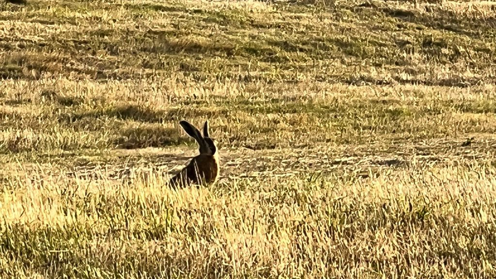 Nebenan unterhalten sich zwei Häschen in einer Senke, doch als ich die Handylinse ausgerichtet habe, sitzt da nur noch einer… wo ist denn dein Kumpel abgeblieben? Alles klar, da muss wohl die Schleppleine wieder dran. Sorry ihr beiden für den unterbrochenen Morgenplausch, aber so schnell wie ihr flitzen könnt, ist Luna natürlich nicht. Fünf Minuten später ist sie völlig breit wieder neben mir und wir wenden uns dem Frühstück zu.