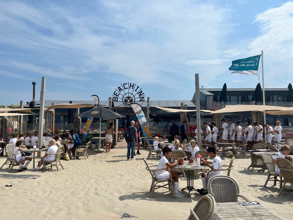Vor dem Bistro lassen sich Unmengen weißbekleidete Fußballkids ihre Pommes schmecken und wir gönnen uns ein Tomatentoast. Herrlich!