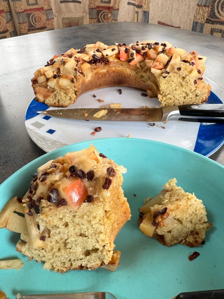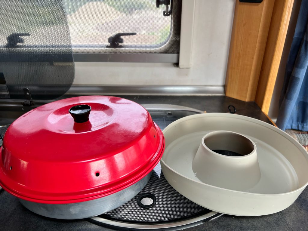 Am frühen Nachmittag soll für heute Schluss sein und ich finde einen wunderbaren Traumstellplatz am Strand. Was tun, wenn man gern Kuchen hätte und kein Bäcker in der Nähe ist: man bäckt einen Apfelkuchen. Mit meinem wunderbaren Omniabackofen kein Problem. Und es fängt gerade an zu duften, da klopft es. Das nette Paar von der Fähre ist wieder da. Wie klein ist die Welt… äh die Insel. Auch sie wollen stehenbleiben und machen sich nach alter Tradition (sie ist Britin – er Franzose) einen Breakfast Tea. Na da bring ich doch gleich mal nen halben Apfelkuchen rüber – sie sind begeistert.