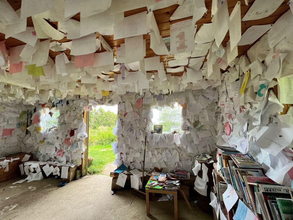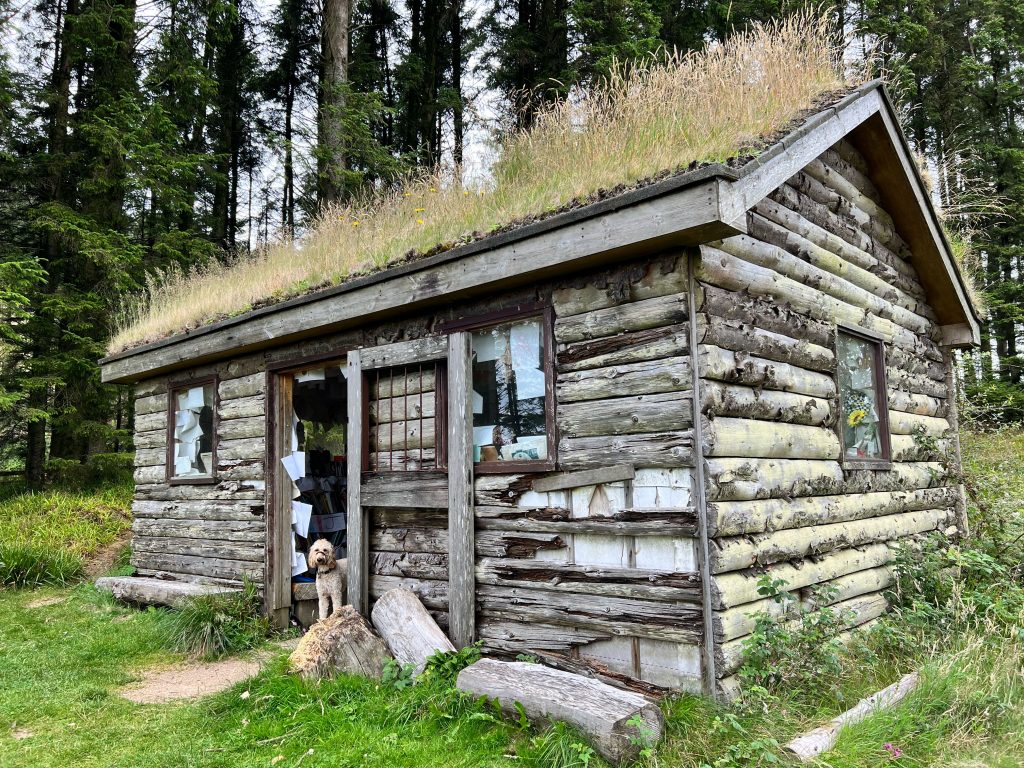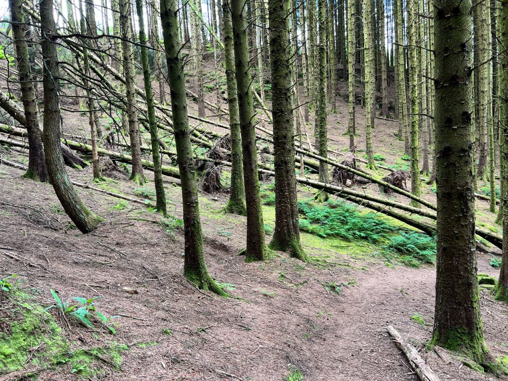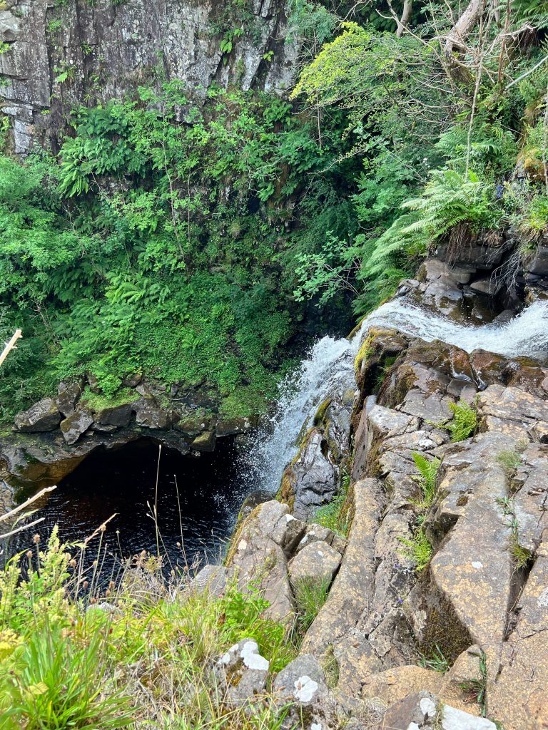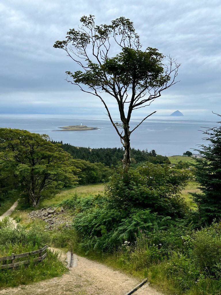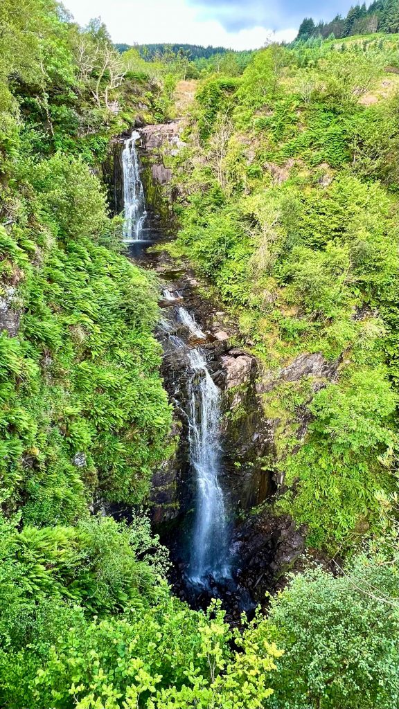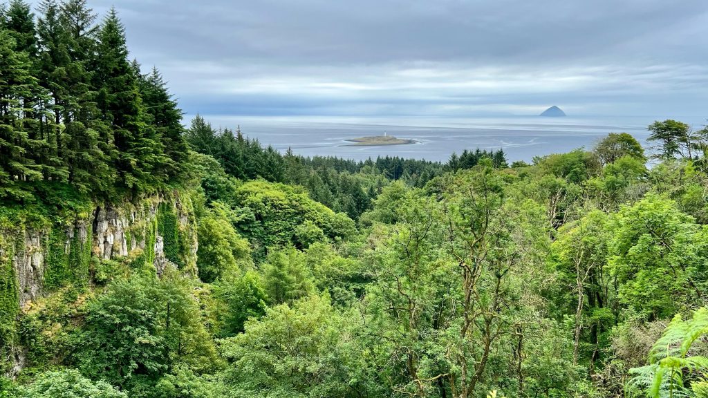 Der „Eas Mor Forest mit einer umweltfreundlichen Bibliothek aus Sturmholz mit Rasendach“ (so mein Reiseführer) wartet. Na da bin ich ja mal neugierig. Wieder wandern wir bergauf und dieses Mal liegen auch die zwei Inseln in unserem Blick: Links Insel Pladda mit dem Leuchtturm und weiter hinten rechts die Felsinsel Alisa Craig. Der Wasserfall hier ist weniger spektakulär, dafür ist aber die Schlucht, die er gebildet hat, umso imposanter. Einmal rundherum führt der Wanderweg und auf dem Rückweg befindet sich eben erwähnte Bibliothek: