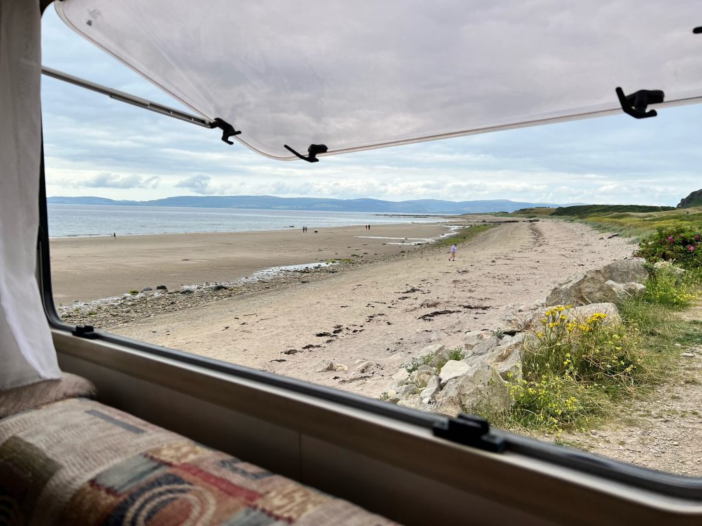 Ich suche mir zum Kaffee dann doch lieber noch einen schöneren Platz als den hier in Brodick an der Hauptstraße. Ein Wanderparkplatz mit Blick ins Tal ist gerade richtig für eine heiße Tasse und die Wohnmobilbesatzung, die hier übernachtet hat, liegt um die Zeit noch gemütlich in den Federn. Wir sind ganz leise und stören nicht.