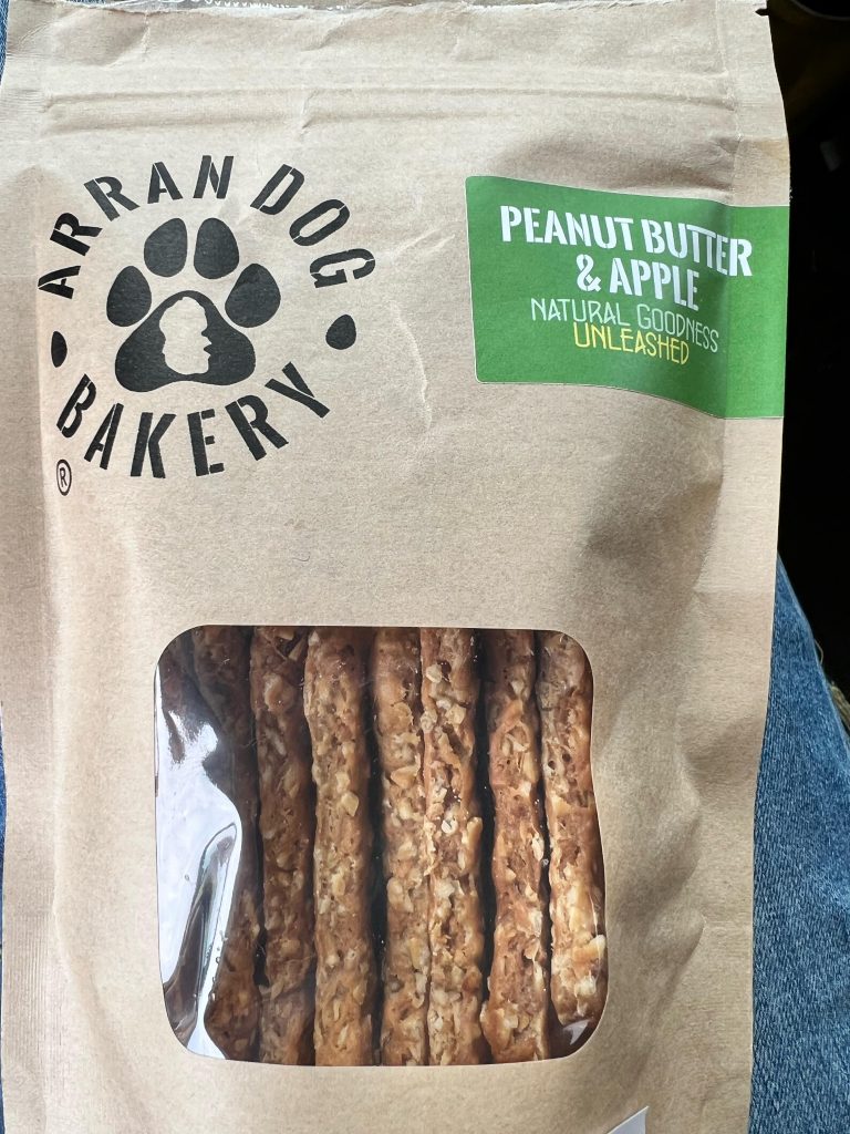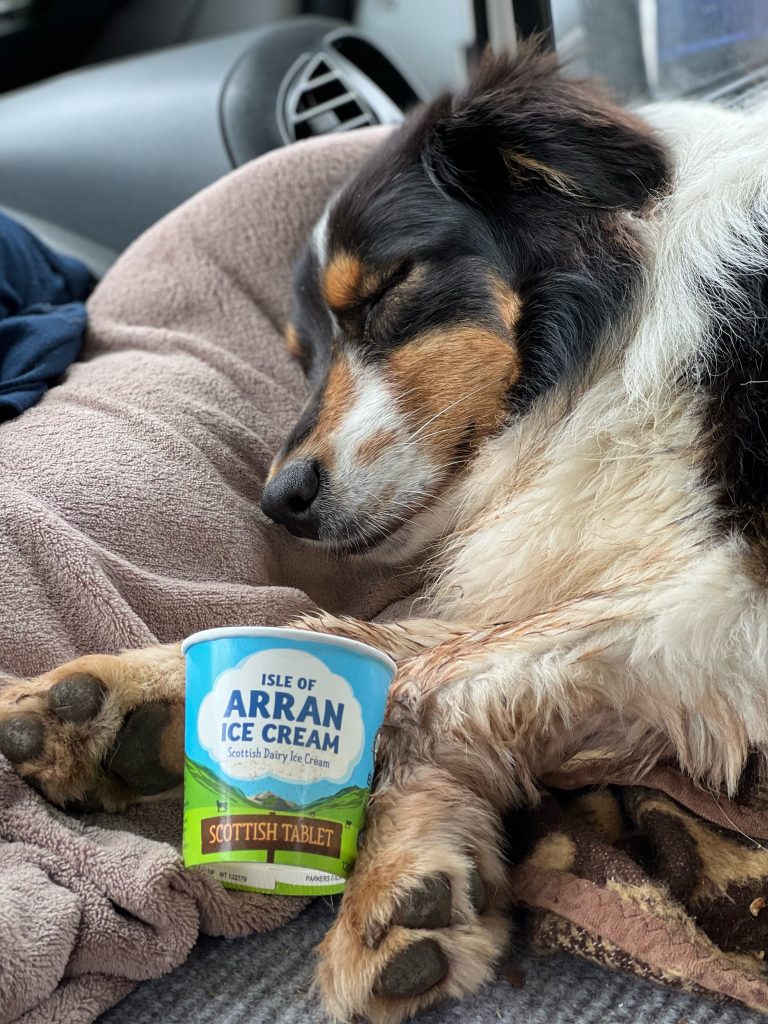 Ich unterbreche die beiden mit dem Startgeräusch meines Womo zwar nicht gerne, aber sorry ich hab noch was vor: Hier in Whiting Bay kann man kostenlos Chemietoiletten leeren. Außerdem gibts einen Wolleladen und ein öffentliches WC. Worüber man sich nicht so alles freuen kann… Die alte Dame im Wolleladen ist sehr freundlich, nur ich kann mich nicht entscheiden… zumindest nicht für Wolle. Arran ist auch bekannt für sein leckeres Eis und die alte Dame bäckt hervorragende Hundekekse. Luna bekommt „Peanutbutter-Apple“ – nobel geht die Welt zugrunde!