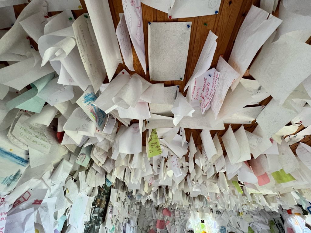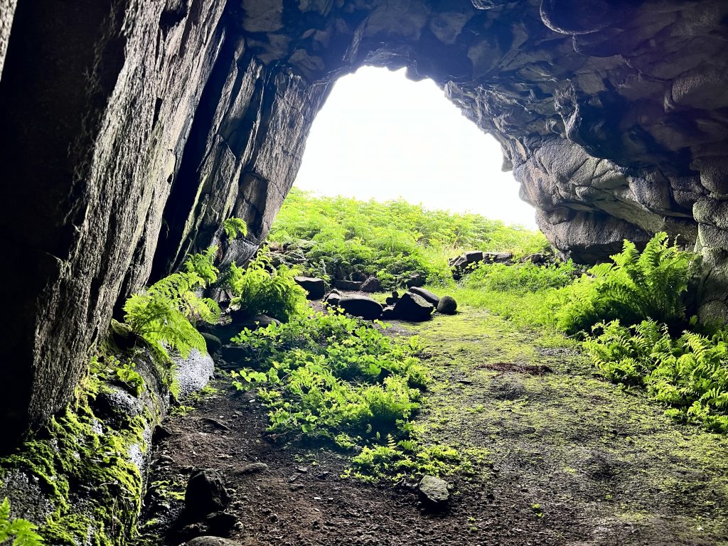 Genug Platz zum Klettern, Laufen, Matschen und Baden hat Luna hier ja und als wir unsere letzte Wanderung zu den Höhlen an der Küste unternehmen ist sie gleich bereit. Rußgeschwärzte Decke ein Kreuz im hinteren Bereich und das überraschende Flügelschlagen mehrerer Tauben lassen uns zusammenzucken. So ein bisschen unheimlich ist das hier schon.