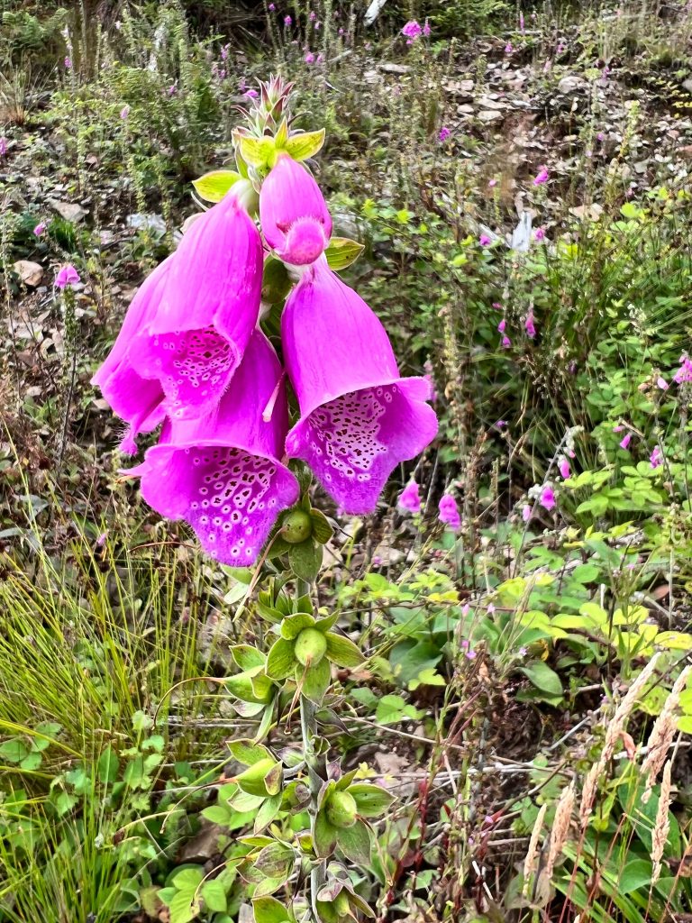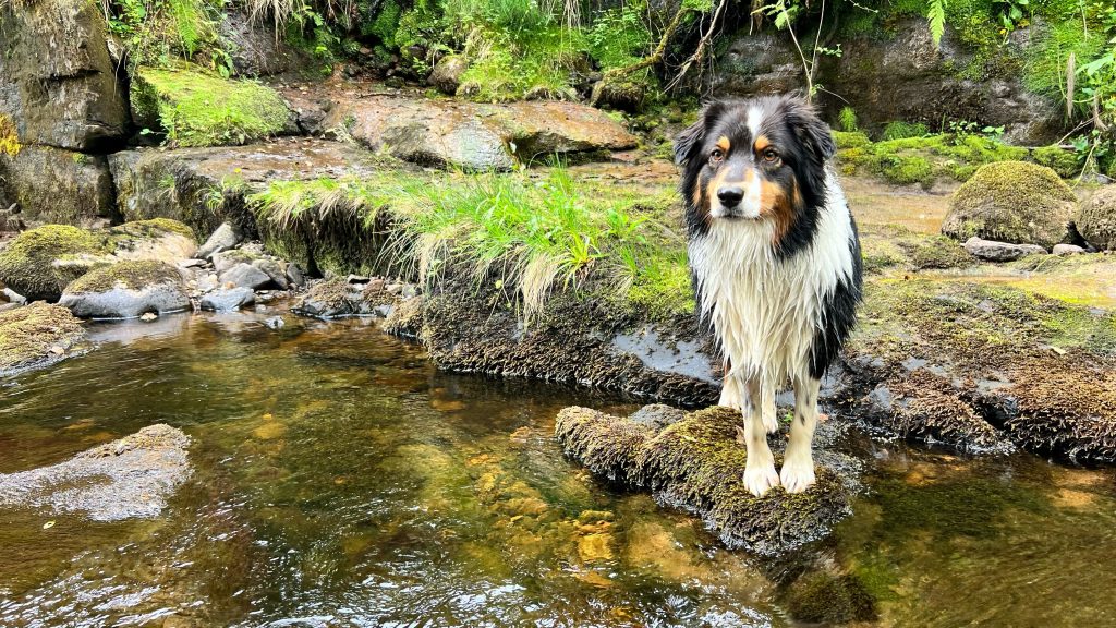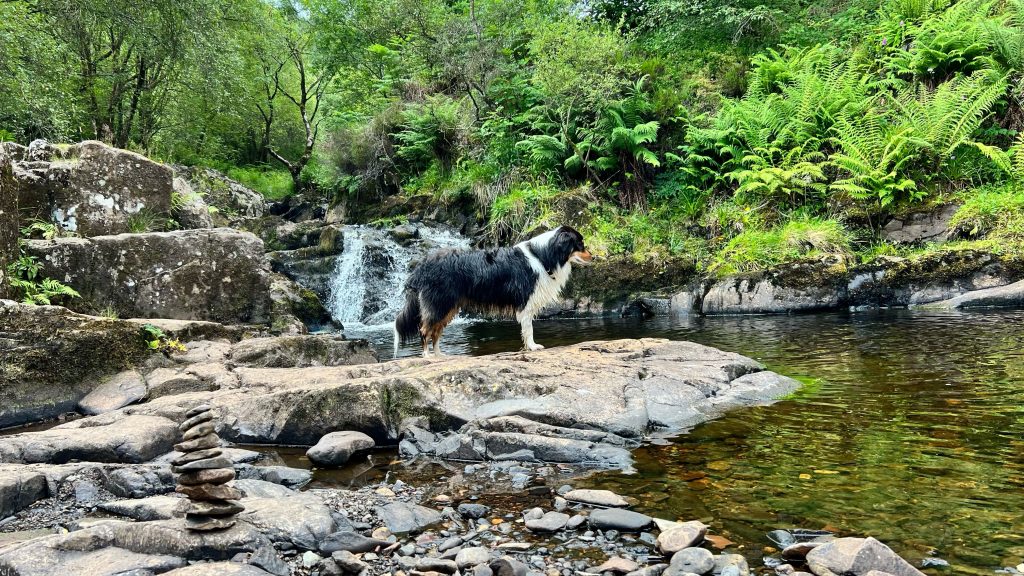 Und so weiß ich auch genau, wo ich heute hinfahren möchte. Zuerst stehen die Glenashdale Falls auf dem Plan. Ein Rundweg führt von Whiting Bay hinauf und immer am Flüsschen entlang. Luna ist in ihrem Element. Aber ich auch, denn rechts und links blüht und grünt es: Mädesüß, Fingerhut, wilde Fuchsien, Weidenröschen … erfreuen den Blick.