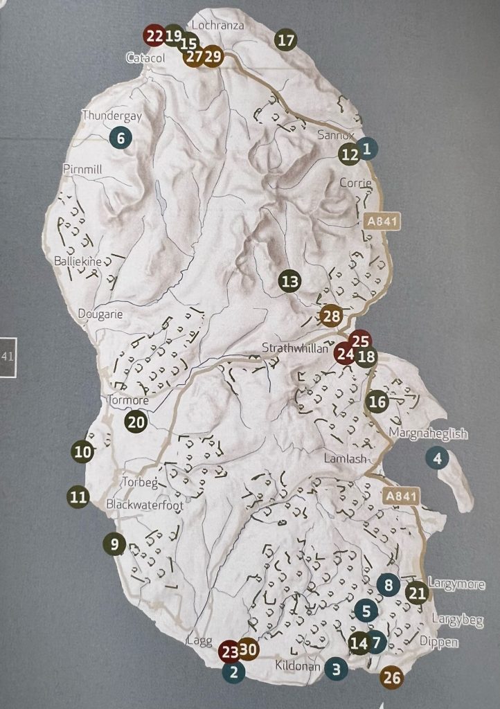 Der Haffmanns-Tolkemitt-Verlag gibt „Wild-Guides” für verschiedene Länder heraus. Die sind mir neu und fassen in sehr kurzen Abschnitten wichtige Tipps geordnet nach Kategorien, wie Wasser, Land, Kulinarisches, Übernachten zusammen. Auf einer Übersichtskarte kann man schnell entdecken, was sich  in der Nähe befindet. Für Arran sieht das so aus: