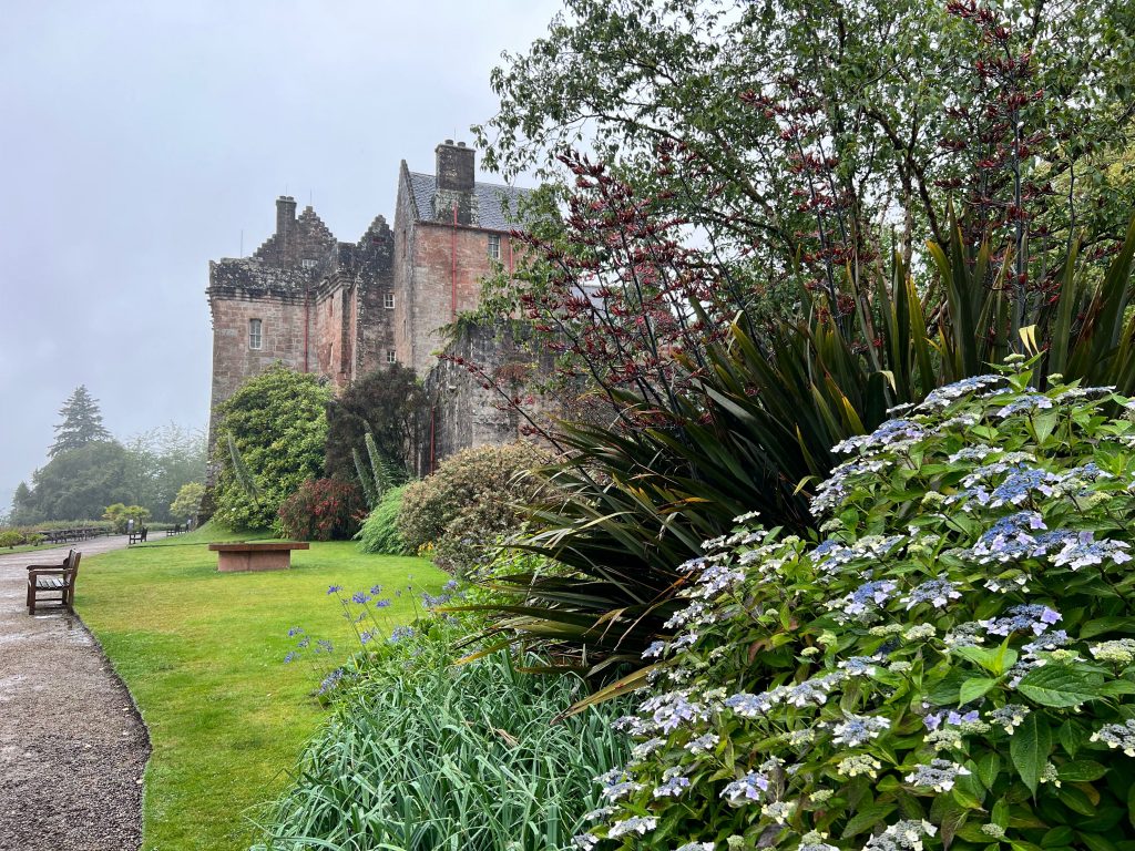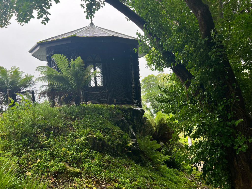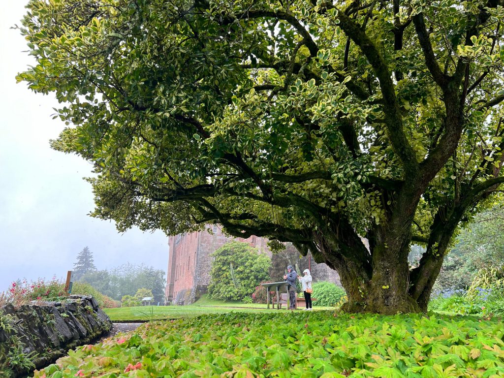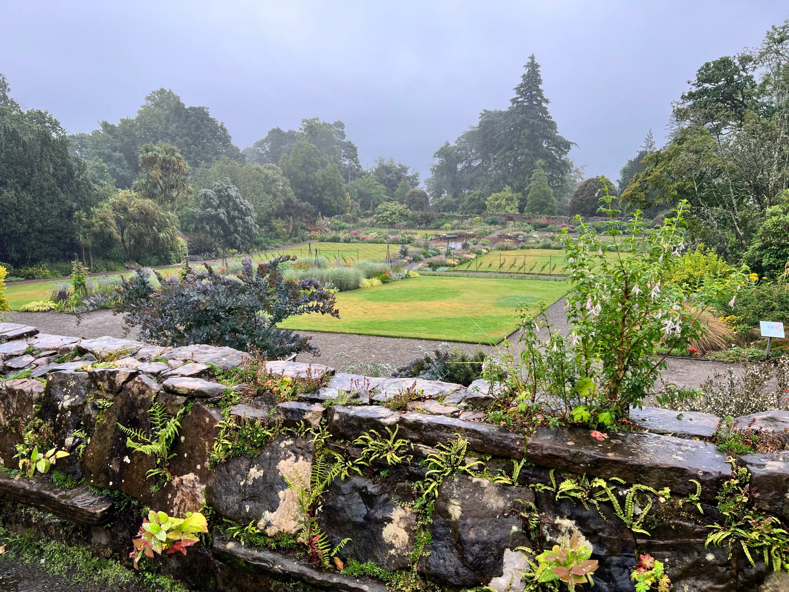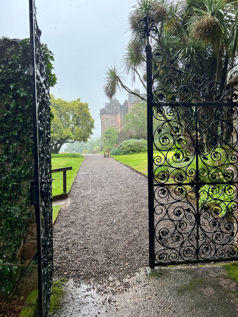 Der Regen wird stärker. Als ich die Insel überquere, fahre ich auf dem höchsten Punkt einmal durch die Wolken, eh ich in Brodrick beim Castle für 14 Pfund Einlass begehre. Durch ein wunderschönes schmiedeeisernes Tor betrete ich den Wallet-Garden. Hunde sind im Schloss nicht erlaubt und Luna schlummert friedlich und müde im Womo.
