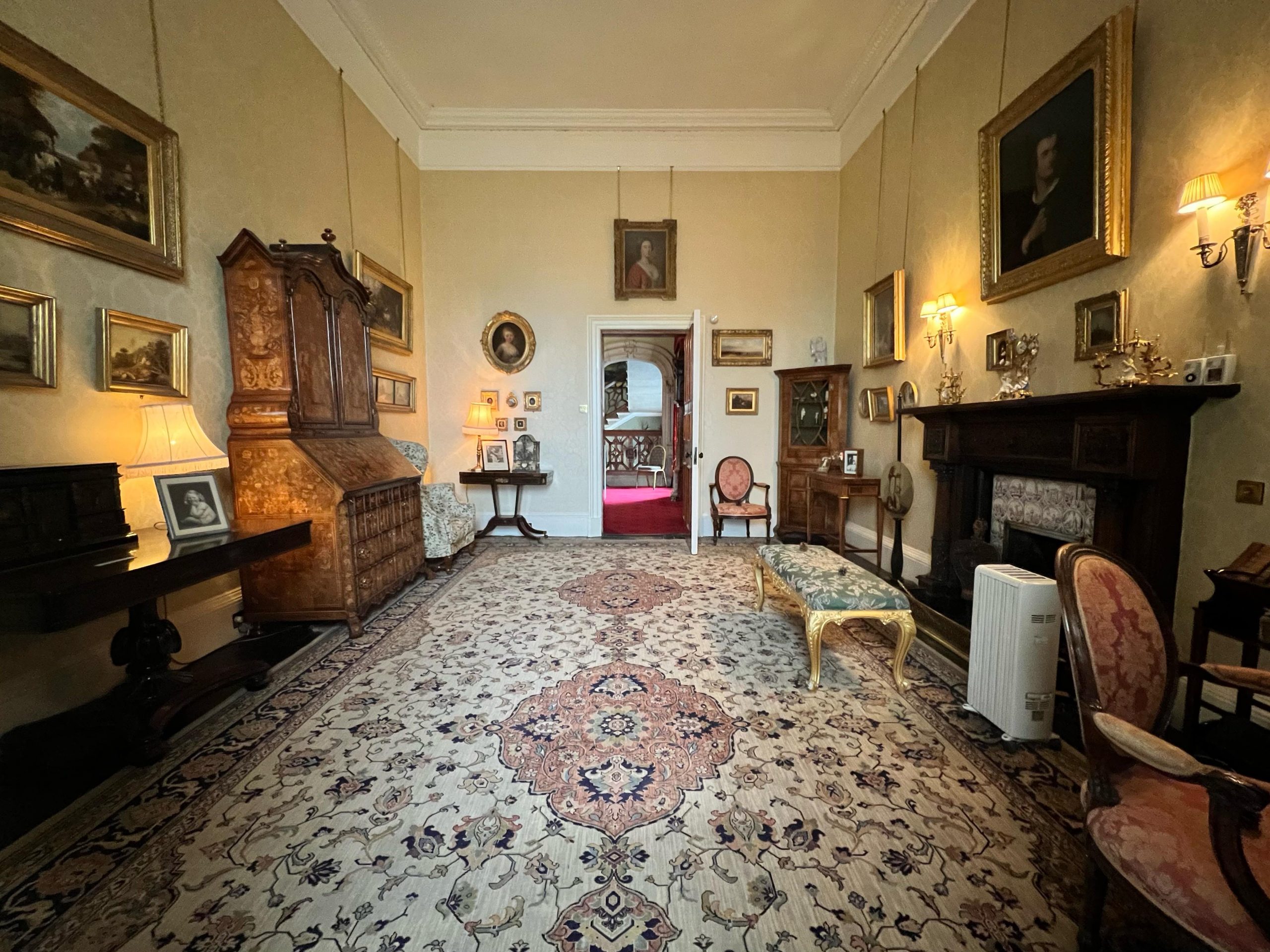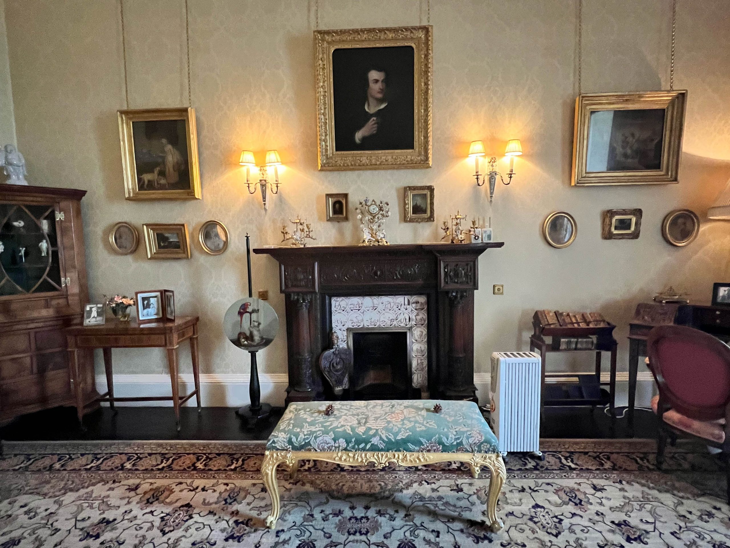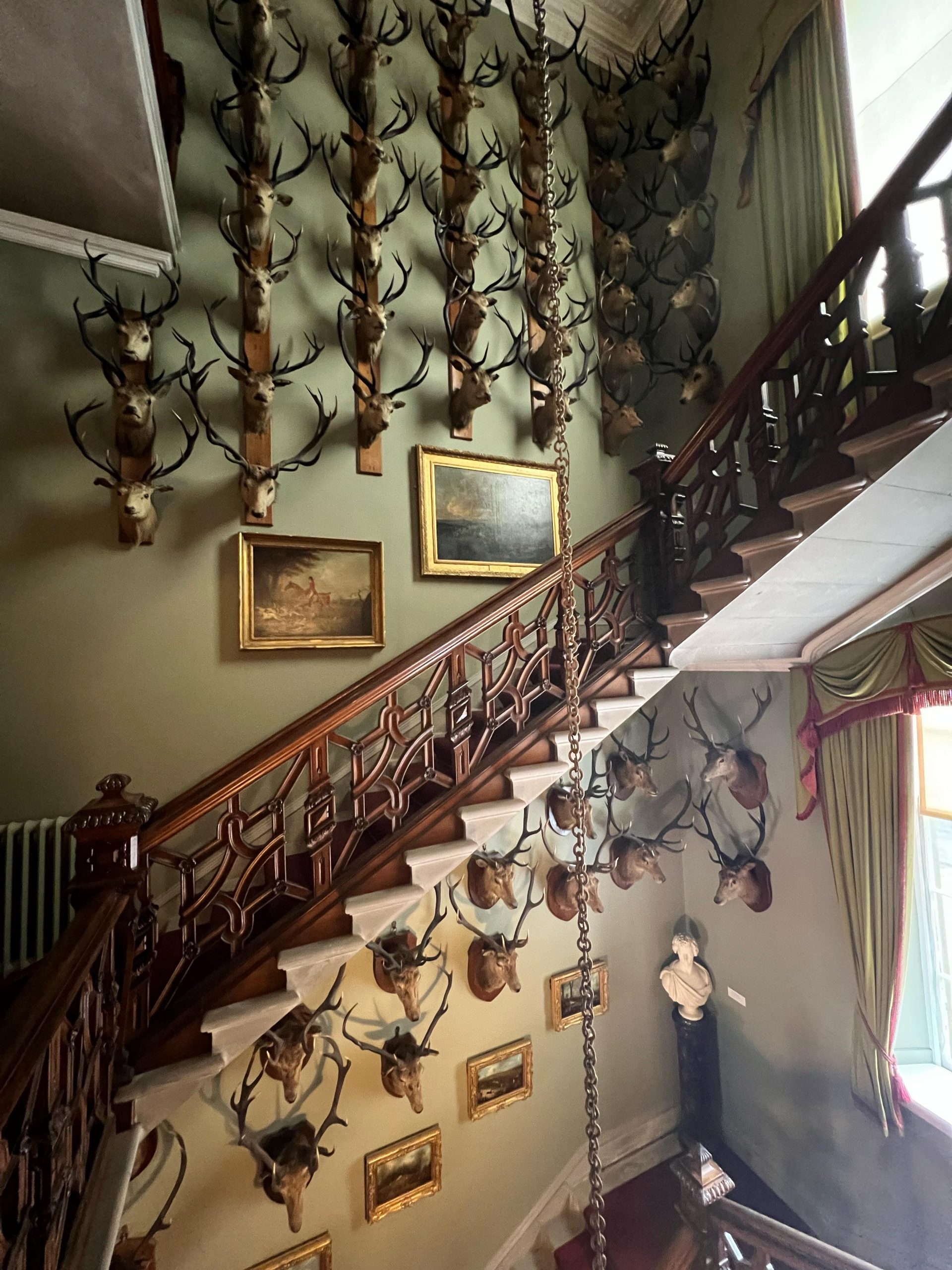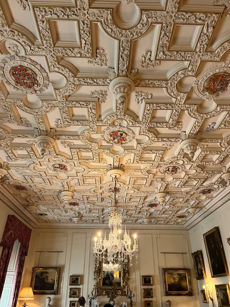 Die Innenausstattung ist beeindruckend. Auch wenn ich nicht so auf tote Tiere an Wänden stehe, beeindruckt schon allein die Anzahl der Schädel in der Eingangshalle. Gut erhaltene Möbel und Einrichtungsgegenstände, Bilder und Stoffe vervollständigen den Eindruck des Lebens im Schloss. Interessant ist auch die Stuckdecke. Mithilfe von Wappen ist hier die über 400 Jahre alte Familiengeschichte der Hamiltons verewigt.