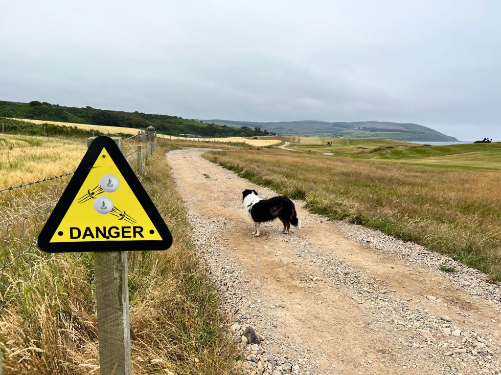 Auf dem Rückweg warnen Schilder auf dem Golfplatz vor fehlgeleiteten Geschossen und ich ducke mich schon vorsorglich, als einer der drei Herren da vorn ausholt und den Ball genau in meine Richtung anvisiert… aber beim Golfen scheint der echte Schlag erst nach 10 Trockenübungen zu sitzen.