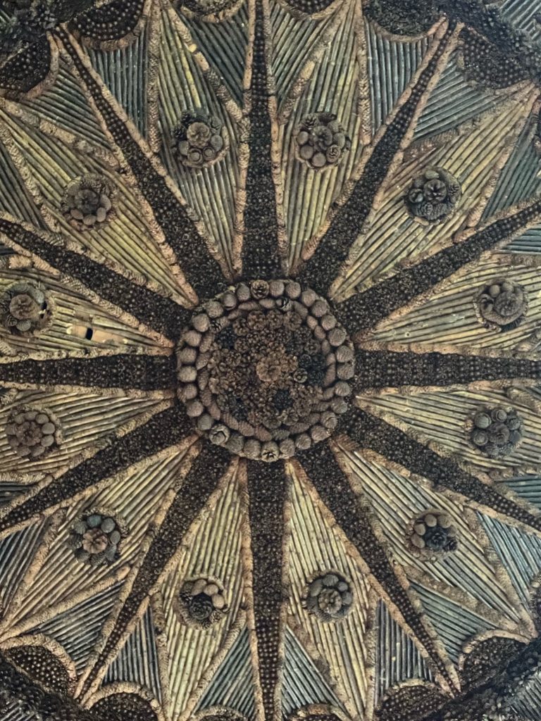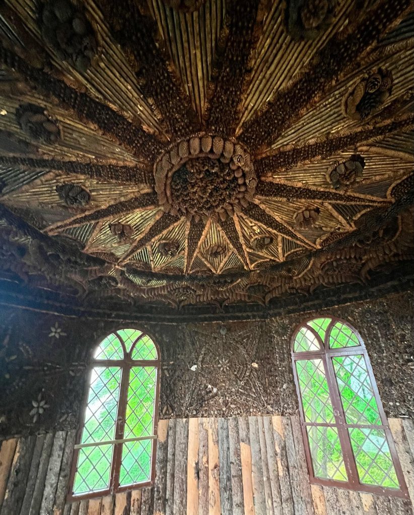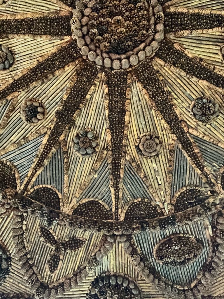 Auch die Gartenanlagen wurden mit Pflanzen und Bäumen aus aller Welt bestückt und eröffnen immer neue Blicke auf Schloss und Natur. Ein besonderes Gartenhäuschen ließ der Gatte von Handwerkern aus Bayern errichten. Darin sind alle Muster aus Zapfen und Zweigen gefertigt.