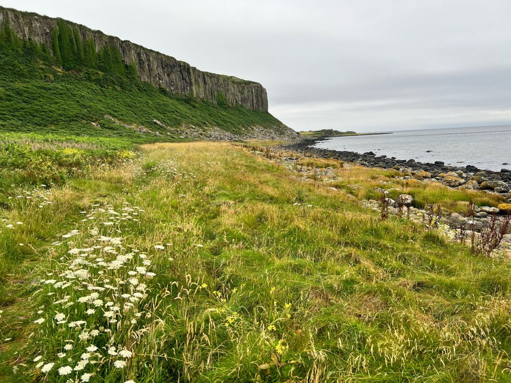 Hinterm Eck tut sich die Klippe der Basaltfelsen am Drumadoon-Point auf – The Doon, so hieß hier früher eine Festung, von der nur noch wenige Reste übrig sind. So wenig, dass ich sie irgendwie übersehen hab… übers Meer hin, in Nordirland, gibt es am Giants Causeway noch mehr solcher Säulen. Die hier sind nicht ganz so beeindruckend, aber auch eine Wanderung wert.