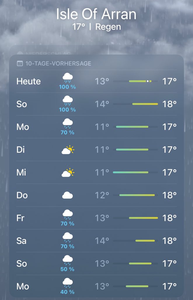 Nun Beine hoch und Buch raus. Luna pennt schon wieder und ich mach’s mir gemütlich, während der Regen auf s Dach trommelt. Wie sind eigentlich die Aussichten? na eher so mittel: