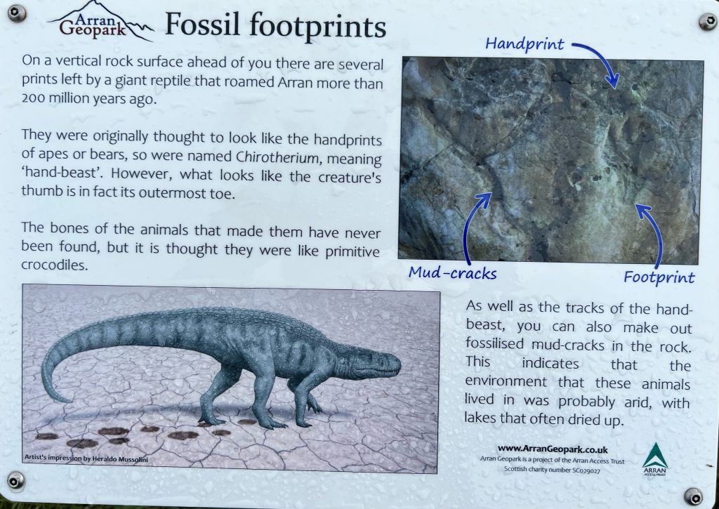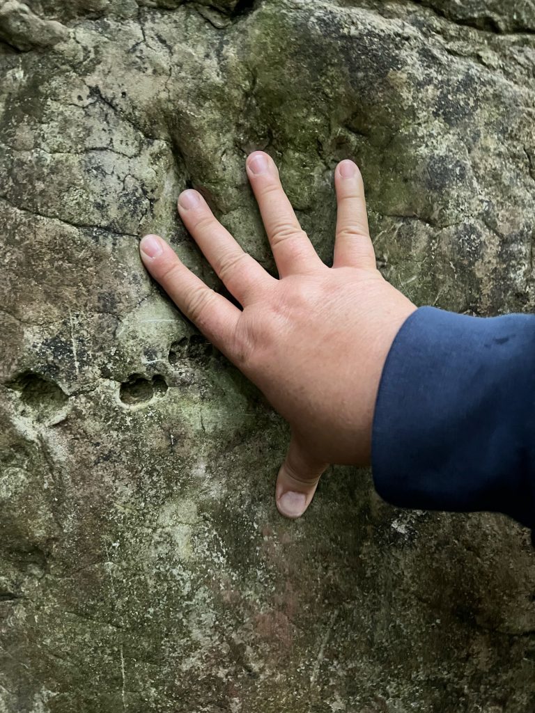 Wir klettern über rundgeschliffene Steine, die mich mit ihrer Sprenkelung an die Wachteleier meiner Nachbarn in Bucha erinnern. Wusstet ihr, dass jede Wachtel mit der Musterung ihres Eis so eine Art Footprint hinterlässt. Man kann wohl genau erkennen, welches Ei von welcher Wachtel stammt, sozusagen am typischen Eiermuster. Das geht mir gerade so durch den Kopf, als ein Schild rechts zu einem weiteren Fußabdruck führt. Diesmal ist es die Pfote eines Sauriers, der hier vor etlichen Jahren langgestapft ist. Der damals waagerechte Weg ist mittlerweile versteinert und um 90 Grad nach vorn geklappt. Steht heute senkrecht im Wald rum.