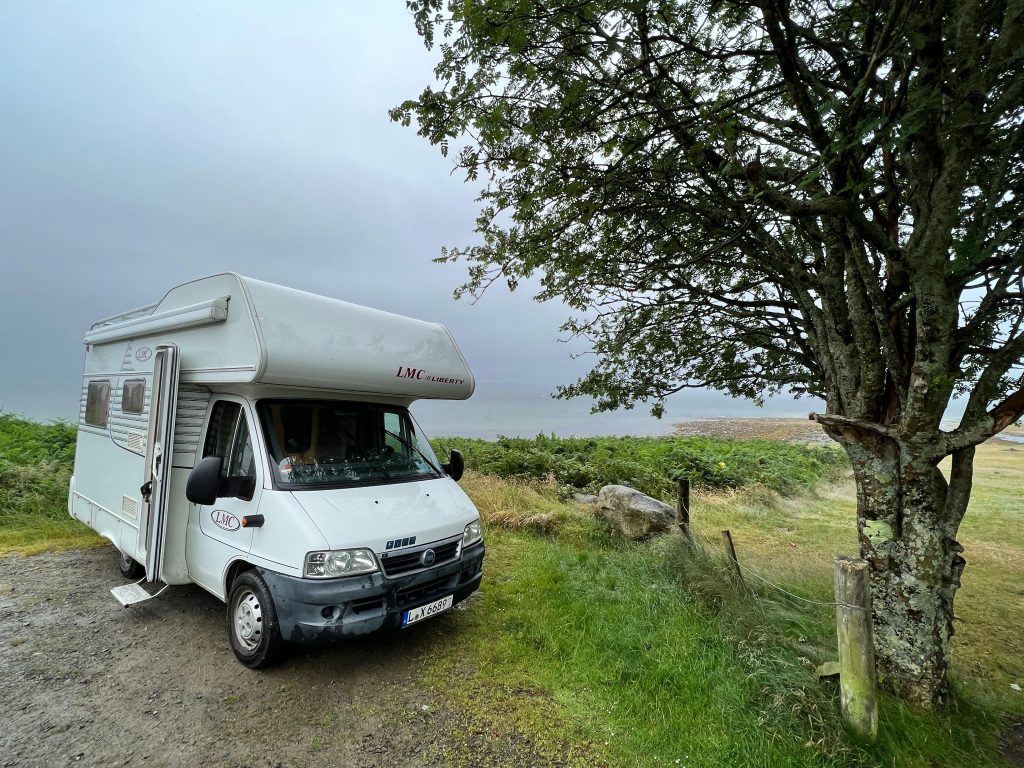 Es fühlt sich ein bisschen so an, wie Schlafen auf Schleifpapier. Mein Bett ist versandet. Aus Lunas Fell rieselt der letzte Strandsand und das, obwohl ich sie gestern Abend mit dem Handtuch abgerubbelt habe… Der Himmel ist trüb und das, worauf wir zuhause schon seit Wochen warten, setzt ein: leiser Landregen. Das ist aber für echte Schotten noch kein Grund, die Regenjacke herauszuholen und so laufen hier alle im Sweatshirt herum. So auch ich – aber die Jacke stecke ich für den Notfall ein 😜.