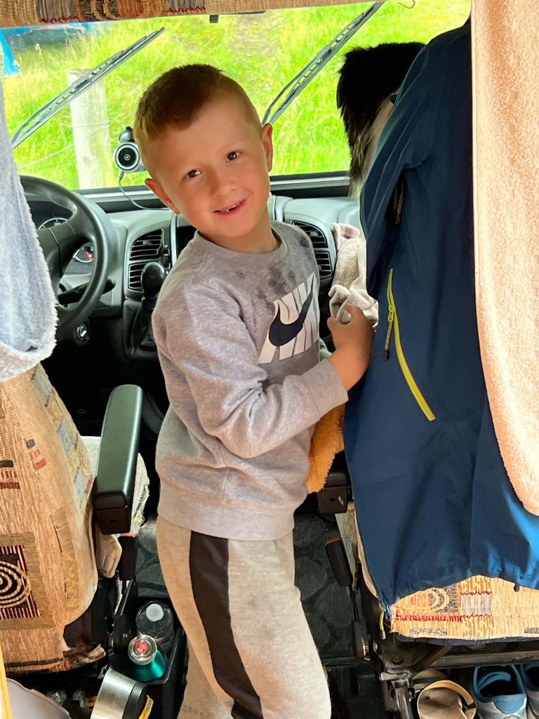 Dann bekomme ich am Morgen noch mehr Besuch, diesmal allerdings Freunde meines Hundes. Rotschöpfige, rotznäsige und fröhliche Schottenkinder aus dem Nachbarzelt. Sie holen Luna zum Spielen ab und wollen natürlich mal mein rollendes Hotel begutachten.